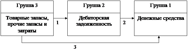Анализируя динамику показателей, можно сделать вывод, что в целом данное торговое предприятие работало в течении рассматриваемого периода неэффективно - интегральный показатель эффективной и хозяйственной деятельности в 2002г. по сравнению с 2000г. снизился с 7,5 до 6,1, т.е. на 18,7%. Также за этот период снизились показатели эффективности использования торгового потенциала на 13,64% и показатель эффективности трудовой деятельности на 41,7%. Сильной падение последнего показателя объясняется тем, что за период 2000-2002 гг. расходы на оплату труда выросли почти в три раза, тогда как розничный товарооборот менее чем в два раза. В 2001г. предприятие сработало с убытком в следствии резкого роста издержек обращения более чем в два раза, что также привело к падению в том же году показателя затратоотдачи на 28,6%. Кроме того, негативной тенденцией является снижение оборачиваемости оборотных средств на 29% в течении исследуемого периода. В качестве позитивных моментов можно назвать стабильный рост розничного товарооборота на 71,8% в течении 2000-2002 гг. и валовой прибыли на 117,9% за этот же период, что однако может быть следствием действия чисто внешних факторов. Для торгового предприятия важным является показатель продолжительности операционного цикла: ПЦ =ОЗ + ОД, где ОЗ – оборачиваемость средств в запасах; ОД – оборачиваемость средств в дебиторской задолженности. Товарные запасы и дебиторская задолженность участвует в трансформации текущих активов в соответствии с приведенной ниже схемой:*