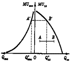 Рис. 2. Графическая иллюстрация закона Госсена. Взаимосвязь между предельной полезностью хлеба и молока.В первом квадранте изображен график предельной полезности хлеба, во втором - молока. При этом единицы измерения натуральных количеств обоих продуктов выбраны таким образом, чтобы в единицу времени можно было потребить либо единицу хлеба, либо единицу молока. Отрезок АВ представляет количество времени, которым располагает субъект для потребления выбранных продуктов питания. Чтобы определить равновесную структуру потребления, потребителю достаточно поднять "планку" АВ (сохраняя ее горизонтальное положение) до "упора", чтобы она заняла положение A`B`. Проекции точек "упора" на ось абсцисс укажут искомый набор потребляемых благ: Qхл*, Qмол*.