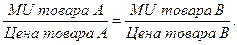 В какой последовательности и в какой комбинации должен купить потребитель товары А и В, чтобы максимально полезно использовать свои 10 долл.? Сначала следует потратить 2 долл. на покупку товара В, так как первая его единица имеет предельную полезность в расчете на 1 долл. 12 ютилей. Затем первую единицу А и вторую В. Итак, 5 долл. мы уже потратили. Смотрим дальше. Покупаем третью единицу товара В (предельная полезность на 1 долл. = 9). На оставшиеся 3 долл. покупаем вторую единицу товара А (предельная полезность на 1 долл. = 8) и четвертую товара В (предельная полезность на 1 долл. = тоже 8). Комбинация товаров, максимизирующая полезность для данного потребителя, достигается при покупке 2 единиц товара А и четырех единиц товара В. Потребитель максимизирует полезность путем выбора такого потребительского набора, удовлетворяющего бюджетному ограничению, при котором отношения предельной полезности к цене одинаковы для всех благ. Это и есть оптимальный набор продуктов. Максимальная полезность при покупке продуктов достигается в том случае, если бюджет будет распределен таким образом, что каждый последний доллар, затраченный на приобретение каждого вида продуктов, принесет одинаковую предельную (добавочную) полезность. Правило максимизации полезности может быть представлено в виде формулы: