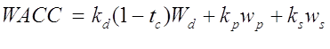 где kd - стоимость привлечения заемного капитала; tc. - ставка налога на прибыль предприятия; kp - стоимость привлечения акционерного капитала (привилегированные акции); ks- стоимость привлечения акционерного капитала (обыкновенные акции); wd - доля заемного капитала в структуре капитала предприятия; wp - доля привилегированных акций в структуре капитала предприятия; ws - доля обыкновенных акций в структуре капитала предприятия. В соответствии с моделью оценки капитальных активов ставка дисконта находится по формуле