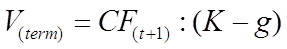 Показатель общей доходности рынка представляет собой среднерыночный индекс доходности и рассчитывается на основе долгосрочного анализа статистических данных. Расчет величины стоимости в постпрогнозный период Определение стоимости в постпрогнозный период основано на предпосылке о том, что бизнес способен приносить доход и по окончании прогнозного периода. Предполагается, что после окончания прогнозного периода доходы бизнеса стабилизируются и в остаточный период будут иметь место стабильные долгосрочные темпы роста или бесконечные равномерные доходы. В зависимости от перспектив развития бизнеса в постпрогнозный период используют тот или иной способ расчета ставки дисконта: • метод расчета по ликвидационной стоимости. Он применяется в том случае, если в послепрогнозный период ожидается банкротство компании с последующей продажей имеющихся активов. При расчете ликвидационной стоимости необходимо принять во внимание расходы, связанные с ликвидацией, и скидку на срочность (при срочной ликвидации). Для оценки действующего предприятия, приносящего прибыль, а тем более находящегося в стадии роста, этот подход неприменим; • метод расчета по стоимости чистых активов. Техника расчетов аналогична расчетам ликвидационной стоимости, но не учитывает затрат на ликвидацию и скидку за срочную продажу активов компании. Данный метод может быть использован для стабильного бизнеса, главной характеристикой которого являются значительные материальные активы, • метод предполагаемой продажи, состоящий в пересчете денежного потока в показатели стоимости с помощью специальных коэффициентов, полученных из анализа ретроспективных данных по продажам сопоставимых компаний. Поскольку практика продажи компаний на российском рынке крайне скудна или отсутствует, применение данного метода к определению конечной стоимости весьма проблематично; • по модели Гордона годовой доход послепрогнозного периода капитализируется в показатели стоимости при помощи коэффициента капитализации, рассчитанного как разница между ставкой дисконта и долгосрочными темпами роста. При отсутствии темпов роста коэффициент капитализации будет равен ставке дисконта. Модель Гордона основана на прогнозе получения стабильных доходов в остаточный период и предполагает, что величины износа и капиталовложений равны. Расчет конечной стоимости в соответствии с моделью Гордона производится по формуле