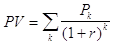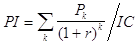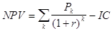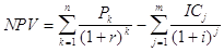 3.1.1. Чистая приведенная стоимость (NPV). Этот метод основан на сопоставлении величины исходной инвестиции (IC) с общей суммой дисконтированных чистых денежных поступлений, генерируемых ею в течение прогнозируемого срока. Поскольку приток денежных средств распределен во времени, он дисконтируется с помощью коэффициента r, устанавливаемого аналитиком (инвестором) самостоятельно исходя из ежегодного процента возврата, который он хочет или может иметь на инвестируемый им капитал. Допустим, делается прогноз, что инвестиция (IC) будет генерировать в течение n лет, годовые доходы в размере P1, P2, ..., Рn. Общая накопленная величина дисконтированных доходов (PV) и чистый приведенный эффект (NPV) соответственно рассчитываются по формулам: