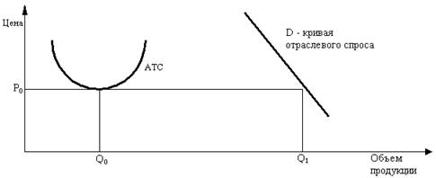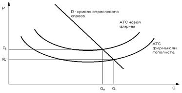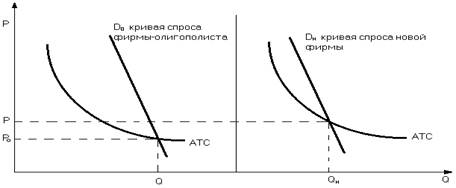 объем производства будет меньше, чем у фирм-участников олигополии ( Фирмы-олигополисты, зная, что появление нового конкурента уменьшит их долю рынка, попробуют не допустить этого, воспользовавшись своими преимуществами. Они установят цену ниже Рн , но в силу экономии от масштабов производства и в этом случае (между Рн и Ро) будут получать прибыль. Новая же фирма понесет значительные потери и вынуждена будет уйти с рынка (при ценах ниже Рн кривая спроса Dн лежит ниже АТС, и, следовательно, новая фирма не может покрыть своих издержек). В приведенном примере мы предполагали, что кривые издержек у олигополиста и новой фирмы одинаковы и все дело в том, что фирма-олигополист достигает более низких издержек за счет больших размеров спроса и масштабов производства. В реальной жизни весьма часто у старой и новой фирмы различаются сами кривые издержек (рисунок 3). Издержки новой фирмы могут быть выше потому, что оно не имеет опыта ведения бизнеса в данной сфере деятельности: ее менеджеры не обладают навыками управления фирмой; не хватает квалифицированной рабочей силы; хуже условия получения банковского кредита; слабее связи с поставщиками; отсутствует доступ к патентам, снижающим издержки производства. Новые фирмы смогут со временем преодолеть трудности, однако - не все из них. Неопределенность ослабляет стимулы для вступления на рынок и уменьшает число потенциальных конкурентов. Рисунок 3