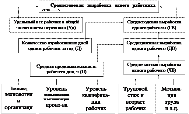 3.2 Анализ производительности труда Важнейшим показателем эффективности использования труда является производительность труда. Уровень производительности труда может быть выражен показателем реализованной продукции на одного работающего и показателем трудоёмкости единицы продукции. Об эффективности использования труда в отраслях материального производства судят по таким показателям, как: – темп роста производительности труда; – доля прироста продукции за счёт повышения производительности труда; – относительная экономия живого труда (работников в расчёте на год) в сравнении с условиями базисного года; – относительная экономия фонда оплаты труда; – отношение темпов прироста производительности труда к приросту средней заработной платы; Значение приращения численности работающих и их производительности труда неодинаково. Первый фактор – количественный, характеризующий экстенсивность использования труда; увеличение работающих мало сказывается на показателях экономичности производства – себестоимости и других, так как дополнительные работники означают и дополнительные затраты на оплату труда. Второй фактор – качественный; на годовую выработку работающего влияет использование рабочего времени в течение года (экстенсивность труда), но в основном она зависит от «чистой» производительности, характеризуемой среднечасовой выработкой одного рабочего (интенсивность труда). Если рост производительности труда обгоняет рост средней заработной платы, то это означает прямое снижение себестоимости производства продукции, а, следовательно, и повышение его рентабельности. На средней выработке работников производственного персонала сказывается не только средняя производительность рабочих за рассматриваемый период, но и удельный вес численности рабочих в общей численности работающих, тем выше уровень производительности труда всех работающих. В связи с этим для оценки выполнения плана и динамики производительности труда имеет важное значение анализ средней выработки рабочего за период, день и час. При построении рядов динамики производительности труда предпочтительно использовать показатель среднедневной или среднечасовой выработки на одного рабочего, чтобы устранить влияние различной продолжительности рабочих дней, месяцев, кварталов, лет. Между наиболее обобщающим показателем – годовой выработкой одного работающего и таким частным показателем, как часовая выработка одного рабочего, лежит область воздействия ряда факторов, которые характеризуют экстенсивность труда. К ним относятся: количество отработанных дней в году, средняя продолжительность рабочего дня, структура производственного персонала. Интенсивность труда и его производительную силу характеризуют количество труда, затраченного в единицу времени, квалификация работника, прогрессивность техники и технологии, организационный уровень производства и др. Все эти факторы определяют часовую выработку рабочего. При анализе сопоставляются темпы прироста производительности труда и средней полной заработной платы – фактически достигнутые, плановые и предшествующих периодов. При сравнениях фактически достигнутых темпов с плановыми следует учитывать, что в плане, как правило, уже заложено определённое опережение. Коэффициент опереже