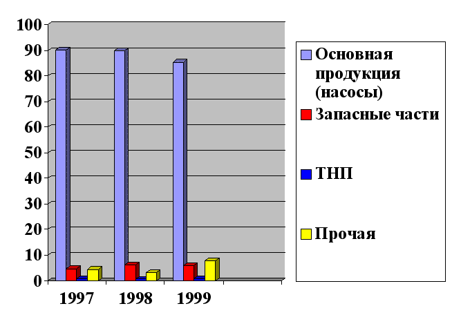 Как видно из таблицы 5 объем товарной продукции в 1998 году возрос на 33,8 % , при сравнении с 1997 г. в действующих ценах. Средняя цена единицы насосного оборудования возросла на 26,1 % . В 1998 году произведено 31.400 шт. насосов , в том числе 2.751 шт. комплект ЗИП “КМ” , при плане производства 31.100 шт. Показатели объемов и структуры производства и реализации продукции в стоимостном выражении за 1997-1999 годы приведены в таблице 6. Таблица 6 Выпуск и реализация продукции
