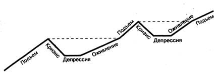 Рисунок 1 Экономический цикл и его фазы Рассмотрим экономический цикл (его также часто называют деловой цикл) в его типичном варианте. Он четко распадается на четыре фазы. В каждой из них наблюдалась разная динамика объема производства, уровня цен, занятости работников, нормы процента. Исходной фазой кругового движения является кризис. Речь идет об общем периодическом кризисе перепроизводства. В этот момент наблюдается падение уровня и темпов экономического роста, сокращение масштабов выпуска изделий. Происходят массовые банкротства (разорение) промышленных и торговых предприятий которые не могут распродать накопившиеся товары. .Быстро растет безработица, сокращается заработная плата. В обществе нарушаются кредитные связи, расстраивается рынок ценных бумаг, падают курсы акций. Все предприниматели испытывают острую потребность в деньгах для уплаты быстро образовавшихся долгов и потому норма банковского процента значительно возрастает. Затем наступает другая фаза — депрессия (от лат. depressio понижение, подавление). Тогда приостанавливается спад производства, а вместе с тем и снижение цен. Постепенно уменьшаются запасы товаров. Из-за незначительного спроса увеличивается масса с бедного денежного капитала и ставка банковского процента снижается до минимума. В период депрессии предложение товаров перестает обгонять спрос, прекращение выпуска товаров снижает их предложение до уровня спроса. В то же время создаются естественные условия для выхода из кризиса. Уменьшаются цены на средства производства, и удешевляется кредит, что способствует возобновлению расширенного воспроизводства на новой технической основе. В следующей фазе оживлении — производство расширяется до его предкризисного уровня. Размеры товарных запасов устанавливаются на уровне, необходимом для бесперебойного снабжения рынка. Начинается небольшое повышение цен, вызванное увеличением покупательского спроса, сокращаются масштабы безработицы; возрастает спрос на денежный капитал, и ставка процента увеличивается. Наконец, наступает фаза подъема. В этот период выпуск продукции превышает предкризисный уровень. Сокращается безработица. С расширением покупательского спроса возрастают цены товары. Повышается прибыльность производства. Увеличивается спрос на кредитные средства и соответственно возрастает норма банковского процента. 1.1.3 Причины цикличностиПри анализе реальных причин, вызывающих цикличность развития экономики, можно выделить три основных подхода. Во-первых, природу экономических циклов объясняют факторами, лежащими вне рамок экономической системы. Это — природные явления, политические события, психологическая заданность и т.п. Речь идет, в частности, о циклах солнечной активности, войнах, революциях и других политических потрясениях, об открытиях крупных месторождений ценных ресурсов или территорий, о мощных прорывах в технике и технологиях. Во-вторых, цикл рассматривают как явление внутреннее, присущее экономике. Внутренние факторы могут вызвать как спад. так и подъем хозяйственной активности через определенные промежутки времени. Одним из решающих факторов является цикличность обновления основного капитала. В частности, начало экономического бума, сопровождающегося резким увеличением спроса на машины и оборудование