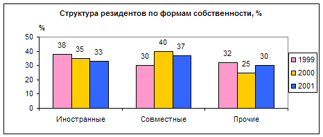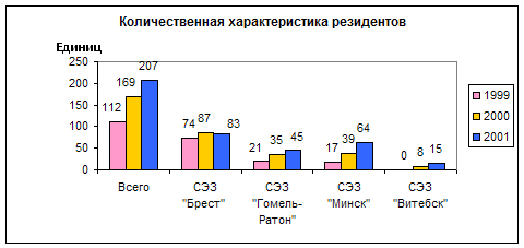 Рис. 1. Количественная характеристика резидентов [6], [7], [15] Действующими в целом по СЭЗ в 2001 г. являлись почти 90% общего количества зарегистрированных резидентов, в том числе в СЭЗ «Брест» - 97,6%, СЭЗ «Минск» - 85,9%, СЭЗ «Гомель-Ратон» - 77,8%. Активно процесс организации производства идет в СЭЗ «Витебск». Все 15 зарегистрированных резидентов начали функционировать. [10, 11] Важным направлением деятельности резидентов СЭЗ является производство промышленной продукции. В целом по все СЭЗ республики на долю промышленности приходится 86,6% общего числа действующих резидентов. Из 161 резидента почти 89% осуществляют свою деятельность в машиностроении металлообработке, химической и нефтехимической, а также лесной, деревообрабатывающей и пищевых отраслях. Относительно невелика доля сельского хозяйства, всего 2 резидента. Доля предприятий, оказывающих транспортные услуги – 2,7%, строительные услуги – 2,2%. Общей коммерческой деятельностью занимается 4,3% резидентов (табл. 2) [6, ст. 14] Табл. 2. Структура распределения резидентов по отраслям и видам деятельности в разрезе форм собственности на 31.12.2001 г., %