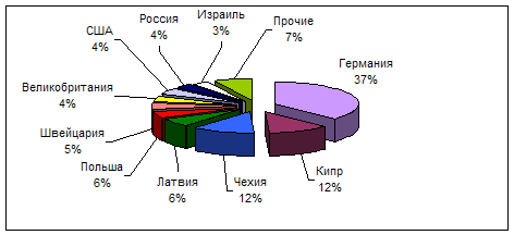 Рис. 2. Структура резидентов по формам собственности [6, 7] О степени привлекательности отдельных отраслей промышленности для инвесторов можно судить по доле СП и ИП в этих отраслях. Так, в пищевой промышленности эта доля равна 88% общего количества резидентов отрасли, в лесной, деревообрабатывающей, целлюлозно-бумажной – 75,6%, химической и нефтехимической – 74,3%, машиностроении и металлообработке – 52, 4%.[6, ст. 14, 17] Из общего объема иностранных инвестиций, полученных резидентами СЭЗ по состоянию на 1 января 2002 г. взносы иностранных инвесторов в уставной фонд составили 60,7%, кредиты – 8,6%, прочие инвестиции – 30,7%. Важнейшие зарубежные инвесторы – Германия, Кипр, Чехия, Латвия, Польша, Швейцария , Великобритания, США, Россия, Израиль (рис. 3.)
