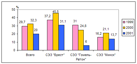 Рис. 4. Рентабельность от реализации продукции [8, 7] За 2001 г. в бюджет СЭЗ уплачено налогов почти в 3,2 раза больше, чем в 2000 г. Итак, можно выявить некоторые тенденции работы СЭЗ в 2001 - 2002 гг.: · заинтересованность иностранных и отечественных инвесторов, представляющих малый и средний бизнес; · фактическое функционирование СЭЗ не как комплексных, а как промышленно-производственных зон с размещением на их территории производств с неглубокой степенью переработки; · преобладание выпуска товаров, не основанных на высоких технологиях.; · равнонаправленность экспортных и импортных операций; · более высокая результативность деятельности предприятий с иностранным капиталом; · ориентированность резидентов без иностранных инвестиций на реализацию продукции на внутреннем рынке, а предприятий с иностранными инвестициями – на внешнем; · финансирование развития инфраструктуры за счет средств республиканского бюджета и фонда развития СЭЗ; · углубление процесса реинвестирования. . ЗАКЛЮЧЕНИЕ Иностранные инвестиции – это то, для чего, собственно, и создаются СЭЗ во всем мире. С их помощью правительство предполагает решить ряд существенных проблем, которые нависают над страной в процессе перехода к рынку. СЭЗ позволяют активизировать внешнеэкономическую деятельность страны по средствам привлечения инвестиций, снизить социальную напряженность, улучшить имидж страны в глазах иностранных инвесторов. Опыт многих стран, а особенно наших соседей Польши, Венгрии, позволяют сделать вывод, что СЭЗ, при разумном к ним подходе, глубоком понимании механизмов функционирования, способны вывести экономику страны на более высокий качественный уровень. Кроме того, примеры этих стран могут послужить хорошим примером деятельности СЭЗ для нашей страны. Процесс создания СЭЗ – процесс требующий тщательного продумывания всех составляющих СЭЗ. Разработка целей и задач должна быть всесторонней и всеобъемлющей, необходимо принимать во внимание множество факторов: экономическое положение страны, стабильность инвестиционного законодательства, стабильность налогового законодательства, внешнеторговые связи страны и прочее. Только в этом случае функционирование СЭЗ будет эффективным. По средствам создания СЭЗ правительства стран пытаются решить те проблемы, которые собственными силами они решить не в состоянии. Для новых инвесторов создаются определенные условия, именно это условия и являются особенностями функционирования СЭЗ. В работе были рассмотрены составляющие СЭЗ, принципы и условия функционирования, этапы создания и опыт деятельности СЭЗ некоторых стран. Исходя из всего вышесказанного можно сделать некоторые выводы: · создание СЭЗ направлено, в первую очередь, на привлечение иностранного капитала; · на территории СЭЗ действует целая система налоговых льгот, часть из которых является постоянной, часть – временной (например, в Венгрии - освобождение от местных налогов на первых 10 лет). Резиденты и вовсе освобождаются от уплаты некоторых налогов (чрезвычайный налог, налог на недвижимость, дорожный фонд и др.); · внешнеторговые льготы, связанные с введением упрощенного порядка осуществления внешнеторговых операций (например, резиденты СЭЗ освобождаются от пошлин, налогов на импорт и прочих видов контроля за импортом) позволяют активизи