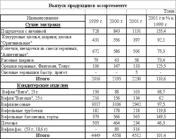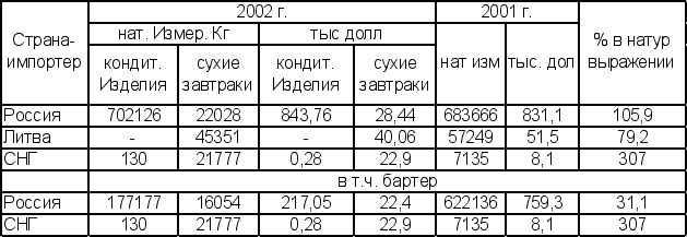 Реферат: Отчет по летней производственной практикеРеферат: Отчет по летней производственной практикеВВЕДЕНИЕ Летнюю производственную практику я прошла на коммунальном унитарном сельскохозяйственном предприятии Витебской области «РУДАКОВО» и на унитарном производственном предприятии витебский кондитерский комбинат «ВИТЬБА». Оба предприятия относятся к агропромышленному комплексу Республики Беларусь и осуществляют внешнеэкономическую деятельность. Целью данной практики является закрепление теоретических знаний, полученных в процессе обучения, приобретение навыков работы в качестве специалиста в сфере внешнеэкономической деятельности, сбор и обработка необходимых материалов по теме научного исследования. Согласно теме индивидуального задания, во время прохождения практики в экономических отделах и отделах сбыта предприятий, я изучала состояние внешнеэкономической деятельности на предприятиях и ее экономическую эффективность. Ни в «РУДАКОВО», ни на «ВИТЬБЕ» нет внешнеэкономических отделов, поэтому осуществлением внешнеэкономической деятельности занимаются экономический отдел и отдел сбыта. При написании отчета о практике были использованы финансово-отчетные и статистические материалы, предоставленные на предприятиях, а также информация представленная в статистическом сборнике «Сельское хозяйство Республики Беларусь. 2001». Отчет содержит 21 таблицу и 23 приложения. Приложения содержат такие материалы как учредительные документы регистрации предприятия, формы бухгалтерского и статистического отчета, документы по подготовке экспортной сделки, документы по платежно-банковским операциям, транспортные, транспортно-экспедиторские и таможенные документы. 4. УПП ВКК «ВИТЬБА» 4.1. Характеристика предприятия и стратегия его развития. Производственно- экономическую деятельность комбинат начал в августе 1991 года с вводом в эксплуатацию первой очереди предприятия. В 1989 – 1991 годах за счет долгосрочных кредитов, предприятием реализован проект строительства и оснащения импортным оборудованием, стоимостью 5,7 млн. фунтов стерлингов, цеха по производству сухих завтраков мощностью 2,5 тыс. тонн в год. Кредит погашен в 1992 году. Вторая очередь комбината была оснащена линией по производству вафельных батончиков в шоколадной глазури, мощностью 750 тонн в год, приобретенной в 1995 году у фирмы «ФРАНЦ ХААС ВАФФЕЛЬМАШИНЕН» за счет кредита, предоставленного Белвнешэкономбанком, на сумму 1900 тыс. DM. Кредит погашен в 1 кв. 2001 года. Третья очередь комбината была оснащена линией по производству плоских вафель мощностью 2500 тонн в год, приобретенной в 1995 году у фирмы «ФРАНЦ ХААС ВАФФЕЛЬМАШИНЕН». Оборудование было приобретено за счет валютного кредита в сумме 7226086,30 DM, полученного в рамках австрийской кредитной линии сроком на 5 лет. Технологическая линия, согласно контракту, поступила на склад комбината в ноябре 1995 года, но из-за отсутствия собственных и централизованных финансовых средств, строительство корпуса под новое производство в 1995 году завершено не было. В 1996 году облисполкомом была выделена часть необходимых денежных средств, что дало возможность завершить строительные работы, смонтировать оборудование и в декабре 1996 года произвести первую пробную партию вафель улучшенного качества. С целью снижения себестоимости 
