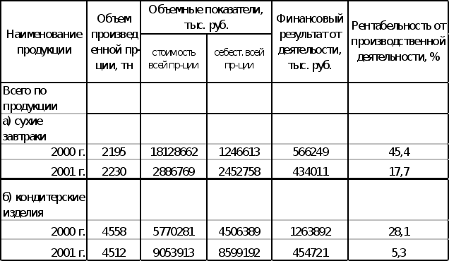 В таблице 4.2.1. приведена динамика объемов производства предприятия за 1999 –2001гг. За этот период комбинат значительно увеличил производство сухих завтраков (на 10,6 %), а выпуск кондитерских изделий по сравнению с 1999 годом вырос незначительно, а по сравнению с 2000 годом сократился на 46 тонн. Если рассматривать ассортимент продукции, то можно отметить, что значительно расширилось производство подушечек с начинкой и зерновых орешков, а также вафельных трубочек, вафельных батончиков и тортов, в то время как объемы производства многих других изделий были значительно сокращены (печенье - на 53,7 %, вафли «Витоша» и «Вита» - на 38% и 31,3% соответственно). Таблица 4.2.2. Себестоимость и рентабельность отдельных видов продукции
