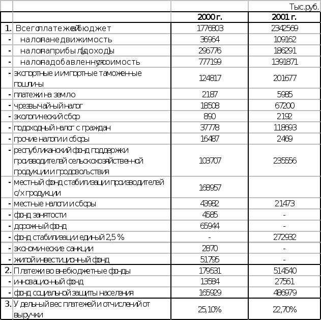 Далее в таблицах 4.2.4. и 4.2.5. приведены сведения об образовании и использовании прибыли кондитерского комбината, а также сведения о платежах и налогах, выплаченных в течение 2000 – 2001 гг. Удельный вес платежей и отчислений от выручки составил в 2000 г. 25, 1%, а в 2001 г. – 22, 7 %.