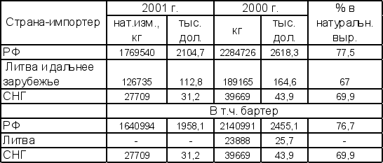 Большая часть экспортируемой продукции реализуется по бартеру. Таким путем был реализован весь объем экспорта в страны СНГ (кроме России). Поставки в Российскую Федерацию на 93,7% в 2000 г. и 92,7% в 2001 г. осуществлялись по бартеру. Только в 2000г. в Литву и другие страны дальнего зарубежья не осуществлялись бартерные поставки, а в 2001 г. они составили 12,6% от общего объема экспорта в дальнее зарубежье. В целом же объемы поставок во все страны сократились на 22,5 –33%. Таблица 4.3.3. О |