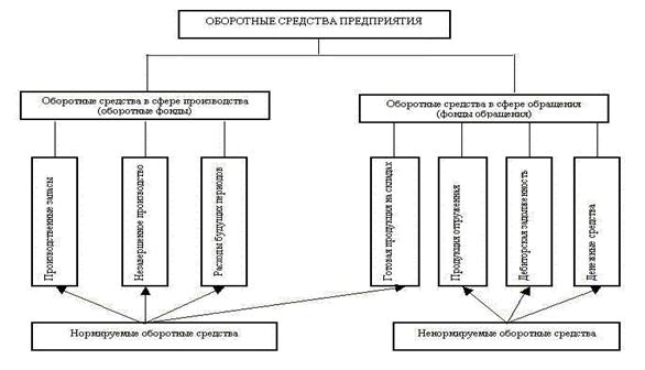 использование оборудования как по времени, так и по производительности: где Кэ – коэффициент экстенсивного использования оборудования; Ки – коэффициент интенсивного использования оборудования. Эффективность функционирования предприятия в целом в большой степени зависит от уровня использования его основных средств. Не меньшую роль в деятельности предприятия играют и нематериальные активы 4. ОБОРОТНЫЕ СРЕДСТВАВ процессе производства необходимы не только здания и оборудование, лицензии на производство продукции и другие виды основных средств и нематериальных активов. Для процесса производства нужны также сырье и материалы, запасные части и полуфабрикаты, а, также прочие ресурсы, которые включаются в состав оборотных средств. Оборотные средства наряду с внеоборотными активами являются важнейшим производственным фактором. Оборотные средства - это денежные средства вложенные в сырье, топливо, незавершенное производство, готовую, но еще не реализованную продукцию, а также денежные средства, необходимые для обслуживания процесса обращения. Характерной особенностью оборотных средств является высокая скорость их оборота. Функциональная роль оборотных средств в процессе производства в корне отличается от основного капитала. Оборотные средства обеспечивают непрерывность процесса производства. Вещественным содержанием оборотных средств являются предметы труда, а также средства труда сроком службы не более 12 мес. Вещественные элементы оборотных средств (предметов труда) потребляются в каждом производственном цикле. Они полностью утрачивают свою натуральную форму, поэтому целиком включаются в стоимость изготовленной продукции (выполненных работ, оказанных услуг). СОСТАВ, СТРУКТУРА И КЛАССИФИКАЦИЯ ОБОРОТНЫХ СРЕДСТВПод составом оборотных средств следует понимать входящие в их состав элементы (рис. 9): · производственные запасы (сырье и основные материалы, покупные полуфабрикаты, вспомогательные материалы, топливо, запасные части…); · незавершенное производство; · расходы будущих периодов; · готовая продукция на складах; · продукция отгруженная; · дебиторская задолженность; · денежные средства в кассе предприятия и на счетах в банке.
