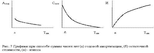 Этот способ эквивалентен способу уменьшаемого остатка, но дает возможность списать всю стоимость объекта без остатка (рис. 7). В течение отчетного года амортизационные отчисления по объектам основных средств начисляются ежемесячно независимо от применяемого способа начисления в размере 1/12 годовой суммы. При способе списания стоимости пропорционально объему продукции (работ) начисление амортизационных отчислений производится на основе натурального показателя объема продукции (работ) в отчетном периоде и соотношения первоначальной стоимости объекта основных средств и предполагаемого объема продукции (работ) за весь срок полезного использования объекта основных средств: