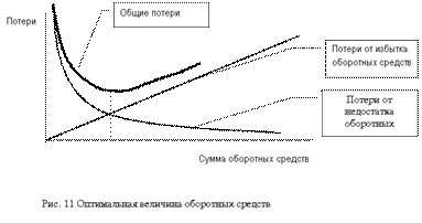 Сумма оборотных средств, находящаяся в распоряжении предприятия должна быть достаточно большой, чтобы процесс кругооборота не прерывался. В то же время, наличие излишков оборотных средств негативно сказывается на результатах его деятельности. 6. МЕТОДЫ ОПРЕДЕЛЕНИЯ ПОТРЕБНОСТИ В ОБОРОТНЫХ СРЕДСТВАХЭффективное использование оборотных средств во многом зависит от правильного определения потребности в оборотных средствах. Занижение величины оборотных средств влечет за собой неустойчивость финансового положения, перебои в производственном процессе и снижение объемов производства и прибыли. Завышение размера оборотных средств снижает возможности предприятия производить капитальные затраты для расширения производства (рис. 11). Потребность в оборотных средствах зависит от множества факторов: объемов производства и реализации; характера деятельности предприятия; длительности производственного цикла; видов и структуры потребляемого сырья; темпов роста объемов производства и т.п.