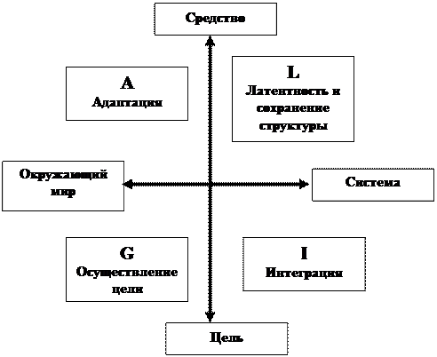 Эти четыре аспекта систем представляют собой в то же время фазы в отношении системы и некоей ситуации и являются функциональными требованиями для сохранения границ системы. Тем самым четыре функциональные проблемы, с которыми сталкиваются малые группы, были обобщены и переосмыслены в функциональные предпосылки, имеющие характер законов для существования и изменения систем действий. Четырёхмерное пространство поделено двумя осями , осью ориентации цели – средство и осью отношений система – окружающий мир. Функции структурируют систему на подсистемы. Подсистема А обеспечивает непрерывное структурное изменение в системе и в отношениях с внешним миром. Подсистема G определяет цели системы и средства для их достижения и применяет их. Подсистема L действует в направлении сохранения структуры системы и преодолевает возникшие противоречия и напряжённость. Подсистема I осуществляет интеграцию системообразующих единиц. Таким образом, каждой части структуры соответствует определённая функция, которая должна выполнятся системой. Парсонс определяет общество как, социальную систему, которую характеризует высшая степень саморавновесия относительно окружающего её мира, другими словами, степень открытости социальной системы "общество" мала. Общество – это сложная социальная система как с вертикальным, так и с горизонтальным дифференцированием. Социальная общность – это стержень общества; его внутрисоциальной средой является: система ценностей (сохранение институционализированных культурных структур), политическая общественность (форма правления), характер экономики. Внесоциальной средой является система культуры, системы личности и формы действия. Структура системы общества