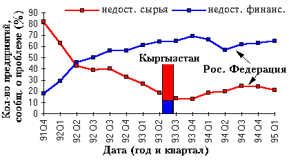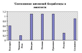 Продолжительность безработицы Хотя и наблюдается рост средней продолжительности поисков работы, существенно, что 60-80% трудоустроенных нашли работы менее, чем за 4 месяца. Для тех, кто нашел работу, будучи безработным, период пребывания без работы был относительно коротким, примерно треть находило работу менее, чем за месяц в 1992 и одна пятая - в 1993. Как следствие, мы видим, что средняя продолжительность безработицы достаточно низка, и мы не наблюдаем той устойчивости, которая характеризует страны Восточной Европы и многие страны ОЭСР. Низкую продолжительность зарегистрированной безработицы можно объяснить прекращением выплаты пособий или уходу из состава экономически активного населения. Долгосрочная безработица (продолжительность свыше 1 года) в момент последнего наблюдения составляла не более 10% всего количества. Общее впечатление следующее: относительно низкий приток в число безработных, большие масштабы текучести рабочей силы, достаточно высокий отток и низкая средняя продолжительность безработицы. Эта картина подвержена сильным региональным различиям. Региональные характеристики безработицы Различия в уровне безработицы. Определяя соотношение региональных уровней безработицы, измеренные по числу зарегистрированных безработных и по опросам на конец 1992г. и 1994г., мы обнаруживаем очень существенные отличия по областям. Дисперсия уровня безработицы по регионам явно возросла. Эта разбросанность по регионам уровня безработицы неудивительна, учитывая различные масштабы спада производства в разных регионах. В том же направлении действует отсутствие мобильности рабочей силы. Результаты обследования показали, что безработные в целом крайне неохотно перемещаются между регионами ради получения более высокой заработной платы или других преимуществ. Кроме того, это усложняется институциональными и другими ограничениями. Заработная плата и рынок труда Широкое использование неполной занятости сочетается с большими задолженностями по выплате заработной платы. На уровне экономики в целом наблюдалось резкое падение реальной заработной платы в начале переходного периода и затем относительная стабилизация. Есть признаки того, что темп роста заработной платы в номинальном выражении зависел от ситуации на рынке труда. Особенно четко это проявилось на региональном уровне. Стала заметной зависимость между региональной безработицей и региональной зарплатой, и к первому кварталу 1994г. мы наблюдаем замедленный рост заработной платы в регионах с высокой безработицей. Более того, изменения в относительной заработной плате обратно связаны с уровнем относительной региональной безработицы . В начале переходного периода такая картина отсутствовала. Можно сделать вывод, что установление региональной заработной платы становится более чувствительным к региональной безработице. Эти изменения в относительной зарплате явно доминировали над изменениями в относительной безработице и занятости, усиливая общее впечатление, что гибкость заработной платы на общенациональном уровне и между регионами была важной чертой переходного периода. Структурный дисбаланс на рынке труда. Наблюдается увеличивающийся разброс в региональных уровнях как вакансий, так и безработицы. Учитывая низкую мобильность труда, мы могли бы ожидать