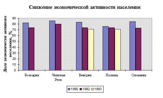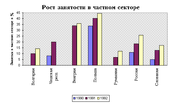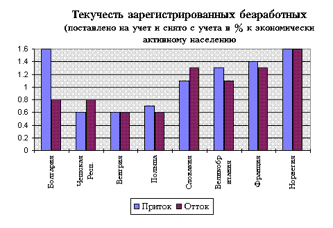 размеры н Данные обследований экономической активности населения Если мы сопоставим данные службы занятости и результаты социологических обследований появляются значительные расхождения. Разрыв составляет примерно 4% от всего активного населения или около 3 миллионов человек. Заметим, что разрыв практически остается постоянным за период с 1992 г. Это показывает, что в противоположность всеобщему предположению, Россия унаследовала большой "запас" безработных от советского периода. Несмотря на силу шока, наблюдается лишь незначительный тренд увеличивающий численность безработных. Основное изменение наблюдается в численности зарегистрированных безработных, от 0 до более, чем 2%. Неполная занятость Измерение численности безработных осложняется также широко распространенной практикой корректировки рабочего времени как одной из реакций предприятий на неблагоприятный шок. Одним из последствий преобладания такой формы ответа на кризис является то обстоятельство, что снижение производительности труда в промышленности России было значительно меньше, чем можно было бы предположить, исходя из макроэкономических данных. Тем не менее, данные об использовании неполного рабочего времени и вынужденных отпусков, публикуемые с 1992 г. несопоставимы во времени и с данными по безработице. Мы можем привести лишь четкую картину изменения масштабов скрытой безработицы в промышлености. Изменения занятости В период с 1990 по 1994 чистые потери занятости составили примерно 4% или 3 млн. рабочих мест. Значительная доля этих потерь - 36% сконцентрирована в промышленности. Потери рабочих мест в промышленности почти в точности перекрыты приростом рабочих мест в частном секторе и самозанятости. Выход населения из состава рабочей силы носит массовый характер. Частью это можно приписать реакции на изначально неестественно высокий уровень экономической активности. Кроме того, первоначально увольнения были сконцентрированы на женской части занятости и среди тех, кого оформляли на досрочную пенсию - именно те группы работников, которые, как мы знаем, характеризуются повышенным "риском" выйти из состава рабочей силы. Текучесть на рынке труда Найм и увольнения Отличительной чертой России являются необычно большой отток из рядов безработных. Сопоставляя ситуацию в 1992-1993 гг. с Восточноевропейскими странами, рынок труда в которых характеризуется низкими показателями притока в ряды безработных, но еще более низкими показателями оттока, мы обнаруживаем во многом противоположную картину - с низкими притоками в безработицу, но динамичным оттоком, включая трудоустройство. Начиная с первого квартала 1994 г. начинается увеличение притока, приведшее к тому, что ежемесячный темп притока в ряды безработных составил 0.5% (от численности занятых). Показатели отток а не только велики (в среднем 15% безработных ежемесячно), но относительно стабильны. Хотя показатель трудоустройства несколько снизился в первом квартале 1994 г.(до 6-7%), в дальнейшем он стабилизировался и в течение 1995 г. около 10% безработных ежемесячно находили работу. Как для притока, так и для оттока, характерны высокие и устойчивые во времени межрегиональные различия. Причиной региональных различий в уровнях безработицы являются прежде всего различия в притоке новых безработных. Низкие показатели при