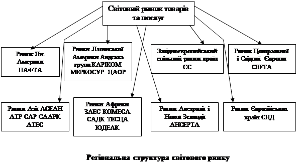Пануюче положення за обсягами світового товарообігу, який становить 3661 млрд. дол. (46,4%) та показником товарообігу на душу населення - 7249 дол. посідає Західна Європа, де проживає 9,2% світового населення. Половину західноєвропейського товарообігу формують країни - ФРН, Франція, Великобританія, Італія з високим рівнем економічного потенціалу, ємким насиченим внутрішнім ринком, високими експортними квотами товарів та послуг. Завдяки розвитку регіонального поділу праці та економічній інтеграції в країнах ЄС створено єдиний внутрішній ринок на принципі "чотирьох свобод" - вільного пересування товарів, капіталів, робочої сили та послуг. А в країнах ЄС створено ефективну модель експортно-імпортних потоків, які поглинають 70% товарних ресурсів. У регіоні створено Європейську валютну систему, діє могутній ринок позикових капіталів, розвинуто пряме інвестування виробництва експортних товарів. Наукомістке виробництво експортних товарів зумовило розвиток ринку послуг, на якому ведеться обмін технологіями, патентами, ліцензіями, ноу-хау, а також послугами інжинирингу, консалтингу, лізингу, франчайзингу. У країнах ЄС переважає пасивне торговельне сальдо, за винятком ФРН з третіми країнами. Це пояснюється залежністю економіки європейських країн від імпорту нафти, природного газу, кольорових, дорогоцінних, рідкісних металів (50% загального обсягу імпорту), а також зерна, тропічних та субтропічних товарів. Друге місце за рівнем розвитку світової торгівлі посідає Північноамериканський ринок (МАРТА), який охоплює 20% світового товарообігу, має більш як 3100 дол. товарообігу на душу населення. Інтегратором американського ринку є США, які концентрують 70% обсягів торгівлі капіталомісткими та наукомісткими товарами, з розвинутим ємким внутрішнім ринком товарів і капіталів. США мають 100 млрд. дол. дефіциту в торгівлі товарами та понад 100 млрд. дол. дефіциту в торгівлі капіталом. Торговельний дефіцит пояснюється високою купівельною спроможністю населення, капіталоємкістю національної економіки, збільшенням витрат на НДДКР, торговельною політикою країни, яка приваблює іноземний капітал, створює вигідні умови для розміщення філій ТНК, в основному японських та західноєвропейських високотехнологічних компаній, які насичують американський ринок електронною технікою, телекомунікаційними засобами зв’язку, робототехнікою, транспортними засобами, лазерною технікою, контрольними приладами. США одночасно має неперевершені обсяги прямих інвестицій за кордоном - 450 млрд. дол. (в 1991 р.), які направляються в ЄС (224 млрд. дол.), Латинську Америку (77 млрд. дол.), Японію (23 млрд. дол.), Австралію (15 млрд.), Гонконг (6 млрд. дол.), країни ОПЕК (11 млрд. дол). На Азіатські регіональні ринки припадає 27,8% світового товарообігу, де проживає 59,4% населення планети, що зумовлює відносно низький показник товарообігу на душу населення - 659 дол. Однак, у регіоні виділяється Японія - третій центр світової торгівлі, яка має усталене активне торговельне сальдо, +106 млрд. дол., з активною політикою торговельної експансії та вивозу капіталу в США та Нові індустріальні країни Азії. Малі "азіатські дракони" - Тайвань, Сінгапур, Гонконг, Південна Корея демонструють безпрецедентні темпи зростання експортного виробництва електронної техніки та розвитку зовнішньої торгівлі. Вони не перевершен