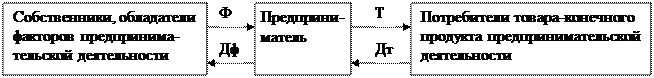 Рис. 1.1. Общая схема предпринимательства. Предприниматель призван удовлетворить запросы определенного круга потребителей в конечном продукте, продавая им товар Т и получая за это денежную выручку Дт. Конечный продукт предпринимательской деятельности, реализуемый потребителю в виде товара, может быть самым разнообразным. Это все то, в чем нуждается потребитель и что способен продать ему предприниматель: здания, сооружения, жилье, имущественные ценности, потребительские товары, информация, интеллектуальный продукт, деньги, валюта, ценные бумаги, все виды услуг, строительные и другие работы. Чтобы реализовать товар, надо его иметь. Поэтому предприниматель приобретает, получает или сам производит товар и осуществляет его продвижение для продажи потребителю, покупателю. Процесс получения предпринимателем продукта, необходимого потребителю, требует для осуществления наличия ряда факторов предпринимательской деятельности. Это все то, что использует предприниматель в своей деятельности, то есть средства производства и обращения товаров в виде рабочей силы, материальных, информационных, финансовых ресурсов, используемых для производства, транспортирования, продажи товаров. Частично предприниматель может сам обладать такими факторами. Если же он ими не обладает, то приобретает факторы Ф у их обладателей, собственников за денежную сумму Дф и с их помощью производит , получает, достает и продает потребителю товар Т. В простейшем случае, когда факторы сами и есть нужные потребителю товары, предприниматель приобретает их и продает потребителю. В подобной ситуации он становится торговым посредником между владельцем товаров и потребителем. Как следует из рассмотренного, схема предпринимательства может быть представлена в виде логической формулы : ДФ - Ф - Т - ДТ. Предприниматель приобретает за деньги Дф средства предпринимательской деятельности Ф, затем преобразует их в товары Т и реализует их, получает в итоге деньги Дт. Вырученные, полученные в итоге деньги Дт должны быть больше денег Дф, затраченных на факторы, с тем, чтобы иметь прибыль. Предпринимательская деятельность организуется таким образом, чтобы все действия осуществлялись за определенное время, для этого предпринимательству необходим высокий уровень организации. Продолжительность операции оказывает значительное влияние на ее эффективность, прибыльность. Обычно чем короче период сделки, тем выше ее эффект для предпринимателя. С одной стороны, снижаются затраты, а с другой - увеличивается оборачиваемость денежных средств и потому меньше денег связывается в обращении. Таким образом, есть основания утверждать, что и время есть фактор предпринимательства. Предпринимательская деятельность представляет совокупность последовательно или параллельно, одновременно проводимых операций. Каждая бизнес-операция - это один завершенный цикл предпринимательства. По отношению к такой операции допустимо применять термин “бизнес-сделка”. В бизнесе под сделкой понимается основанное на письменном договоре или устном соглашении взаимодействие двух или нескольких хозяйственных субъектов, лиц в интересах получения взаимной выгоды. В зависимости от содержания предпринимательской деятельности и ее связи с основными стадиями воспроизводственного процесса различают раз