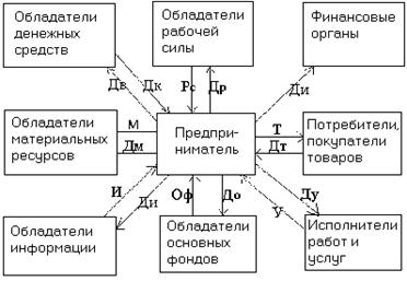 Рис. 1.2. Схема предпринимательской деятельности. В большинстве видов предпринимательства для выполнения предпринимательской операции нужны материальные ресурсы в виде сырья, материалов, энергии, готовых товаров. Приобретая недостающие материальные ресурсы М и у их обладателей, предприниматель уплачивает им денежные средства Дм, то есть получает материалы в обмен на деньги. Иногда материальные ресурсы приобретаются путем бартерного обмена. При коммерческом предпринимательстве приобретенные материальные ресурсы могут быть в виде готового товара. Третий важнейший вид необходимых для предпринимательства факторов, средств представляют основные фонды в виде зданий, сооружений, помещений , машин, оборудования, аппаратуры, вычислительной и организационной техники . Отсутствующие у предпринимателя основные фонды Оф приходится приобретать, арендовать у их обладателей за деньги До. Для проведения большинства предпринимательских операций нужна информация в виде сведений, данных, чертежей, технологий, проектов, знаний, документов. Информация в наше время тоже стоит денег. Чтобы получить недостающую информацию И, предприниматель должен заплатить за нее деньги Ди. Наряду с упомянутыми факторами предпринимателю могут понадобиться работы и услуги, которые он не способен выполнить собственными силами. За предоставление услуг У надо уплатить деньги Ду. Проводя предпринимательскую операцию, предприниматель затрачивает и собственные ресурсы в виде своей рабочей силы, материалов, денежных средств, информации. Это внутренние затраты, но и они стоят денег, общая сумма которых равна Дв. Кроме всех указанных ресурсов и форм их получения предпринимателю зачастую приходится прибегать к приобретению отдельных ресурсов в долг, в виде займа. Ведь ему нужны ресурсы, средства еще до того, как они будут возмещены, окуплены в результате продажи товаров и получения денежной выручки Дт. Следовательно, предпринимателю необходим начальный капитал. Если такого капитала нет, то приходится его заимствовать. Заимствование может иметь место в натуральной, вещественной и денежной формах. Если предприниматель осуществляет операцию успешно и получает выручку за проданный товар, превышающую затраты, то в итоге операции образуется прибыль, исчисляемая: