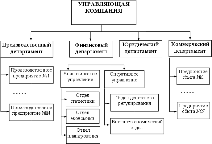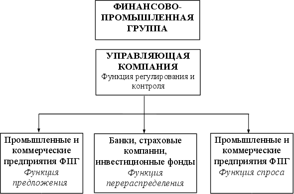 Рис. 1.2. Структура финансов ФПГ. Можно сказать, что финансово-промышленная группа это маленькая финансовая система, в которой имеется свое "государство" (управляющая компания), "кредитная система" (банки, страховые компании, инвестиционные фонды и т.п.), и "субъекты финансовой системы" (коммерческие и производственные предприятия ФПГ), через которые идет формирование и использование финансовых ресурсов ФПГ. Центральную роль в функционировании ФПГ выполняет управляющая компания, которая в рамках ФПГ выполняет следующие функции: разрабатывает программу развития всей ФПГ и ее отдельных предприятий; совместно с коммерческими и промышленными предприятиями определяет инвестиционную политику ФПГ, направленную на дальнейшее развитие как отдельных предприятий, так и ФПГ в целом; совместно с банками, страховыми компаниями, инвестиционными фондами разрабатывает кредитную политику ФПГ, направленную на выпуск векселей, предоставление кредитов и т.д.; осуществляет контроль за выполнением финансовых и инвестиционных планов. Объединение производственного, банковского, торгового, страхового капиталов структурных подразделений ФПГ позволяет аккумулировать временно свободные средства, с помощью которых предприятиям предоставляется возможность финансировать собственные и совместные первоочередные потребности [4,9]. При сегодняшнем ограниченном бюджетном финансировании немаловажно снижение претензий предприятий с государственной собственностью на федеральную поддержку. За счет внутрикорпоративного оборота и аккумулирования ресурсов в рамках ФПГ, предприятия в состоянии обеспечить переориентацию на самофинансирование и сведение до минимума использование государственной инвестиционной помощи. Финансово-промышленное объединение позволит снизить вероятность разорения отдельных предприятий, а также положительно скажется на ценообразовании. Общий интерес сведет к нулю ценовые накрутки на продукцию, которая проходит по технологической цепочке между предприятиями-участниками ФПГ. Рост цен перестанет провоцироваться на внутригрупповом уровне взаимоотношений членов объединения [4,9]. В финансово-промышленной группе основной сферой приложения банковского капитала становится производство, развитие которого только и способно в конечном счете оздоровить всю денежно-кредитную систему. В то же время и банковский капитал стремится иметь стабильные источники пополнения своих доходов и надежные сферы приложения с материальным обеспечением 1.3. Структура системы управления корпоративными финансамиУправление — процесс выработки и осуществления управляющих воздействий субъектом управления [10,13]. Управляющее воздействие — воздействие на объект управления, направленное на достижение цели управления. Выработка управляющих воздействий включает сбор, обработку, передачу необходимой информации, принятие решений. Специфика корпоративного управления в том, что объектом управления является совокупность независимых друг от друга предприятий, которые взаимодействуют между собой [8]. Особенность взаимодействия заключается в том, что каждое предприятие совокупности является неотъемлемой ее частью, что позволяет рассматривать совокупность как единое целое при осуществлении процесса управления. Поскольку операции распредел