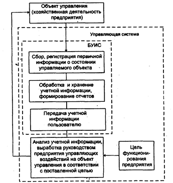 Рис. 1. Схема управления предприятием в условиях использования БУИС Бухгалтерская информация помогает руководителям не только понять и проанализировать итоги, но и прогнозировать результаты деятельности предприятия при принятии различных решений. Существуют внешние пользователи бухгалтерской информации. Это акционеры, инвесторы, кредиторы, покупатели, клиенты, аудиторы и инспектора налоговых служб. Акционерам и инвесторам важно знать, насколько эффективно и прибыльно используется собственный капитал владельцев предприятия, нужны ли ему новые инвестиции или их объем следует уменьшить, может ли фирма в будущем оставаться прибыльной и при каких условиях. Кредиторов интересуют вопросы о необходимости ссуды, способности предприятия своевременно выплачивать проценты за кредит и в срок расплатиться с долгами. В этой связи бухгалтерская информация все в большей степени становится связанной с технико-экономическим обоснованием и с бизнес планированием при привлечении инвестиций. Для покупателей продукции важны соответствие рекламы предприятия фактическому состоянию дел, обоснованность цены на товары, возможность обеспечения гарантийного обслуживания. Государственные службы интересуются полнотой и правильностью определения прибыли и исчисления налогов, соблюдением антимонопольного и валютного законодательства. При принятии решений следует учитывать, что бухгалтерская информация является в известной мере приблизительной, а не абсолютно точной. В этой связи проблема толкования и правильного использования информации ложится и на лицо, принимающее решение, и на бухгалтера. Бухгалтер предоставляет полезную информацию, а пользователь должен ее истолковать и применить при выработке решений. Чтобы бухгалтерская информация была полезной, она должна быть достоверной и значимой. Достоверность показывает, что информация полностью отражает хозяйственные процессы на предприятии, легко проверяема и не выражает интересы какого-либо конкретного лица. Значимость бухгалтерской информации заключается в том, что она должна быть полезной при составлении планов, основанной на обратной связи и поступать к пользователю в нужное время. Обратная связь предполагает знание того, насколько верными оказались предыдущие ожидания. Необходимо учитывать, что выгоды, полученные от использования учетной информации, должны быть больше произведенных на нее затрат. Чтобы бухгалтерская информация достаточно однозначно воспринималась теми, кто участвовал в ее подготовке на предприятии, и теми, кто использует ее вне предприятия, она должна удовлетворять определенным требованиям. Во-первых, бухгалтерская информация должна удовлетворять требованиям сравнения и постоянства. Т.е. нельзя в течение учетного периода использовать разные формы и методы бухгалтерского учета, иначе пропадает возможность сравнения данных. Однако это не означает, что устаревший или неудачно выбранный метод бухгалтерского учета должен использоваться бесконечно долго. Для изменения используемой формы учета должны быть веские основания. Такие изменения могут происходить в том случае, если они совмещены с началом нового учетного периода (года). Во-вторых, бухгалтерская информация должна быть существенной. Не следует терять время на учет незначительных факто