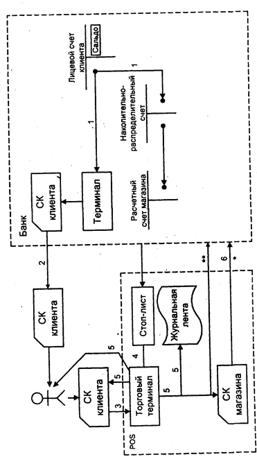 Рис. 11. Технологическая схема расчетов с использованием смарт-карт. * по технологии BGS инкассация через СК - магазин. ** по другим технологиям: инкассация по телекоммуникационным каналам. Деньги с лицевого счета клиента переносятся на СК и одновременно отражаются на специальном накопительно-распределительном счете (Holding Accounting) (I, 2). Далее клиент расплачивается ею, проходит авторизацию на месте расчетов (POS) (3). После проверки по стоп-листу (4) (операция осуществляется терминалом автоматически) происходит обработка платежа в режиме off-line и средства переносятся с карты покупателя на карту магазина ( в системе UEPS) либо с карты покупателя (выдает банк) записываются в торговый терминал (5), который затем инкассируется (6). Данные одновременно отражаются на журнальной ленте и чеке. Чек передается покупателю (5). Проводка содержит код банка владельца, номер его лицевого счета, идентификатор магазина, дату, время и сумму проводки. Из магазина осуществляется телекоммуникационная пересылка транзакции в банк, где по ней происходит списание денег с Holding Accounting на расчетный счет магазина. Смарт-карты, содержащие микропроцессор, меняют технологию расчетов и таким образом создают новые возможности для их участников. Оперативность платежа возрастает, а контроль собственных расходов становится более удобным и конфиденциальным. Клиент может хранить раздельно крупные и обычные суммы на одной карточке. Область памяти, хранящая крупные суммы, может быть защищена специальным паролем, который может заменяться пользователем самостоятельно и многократно. Перемещение средств между этими областями по технологии, используемой, например, в Промстройбанке, может быть выполнено в любом пункте обслуживания. При этом клиент может осуществлять денежные переводы, совершать коммунальные платежи и оплачивать покупки любого размера. Банки-эмитенты открывают новые счета и увеличивают свой доход от участия в операциях POS. При этом общая степень риска по карточкам снижается за счет уменьшения рисков в денежном обороте, отсутствия рисков неплатежеспособных клиентов и потерь от возможного взлома системы или подделок. Улучшается имидж банка, использующего прогрессивную форму расчетов. Технология СК обеспечивает высокую степень автоматизации (операции ручного ввода информации с чеков вообще отсутствуют) и информационного обслуживания всех участников расчетов. Банк не несет ответственности за расходы по поддержанию базы pin-кодов, Снижает расходы по эксплуатации телекоммуникационных сетей и эксплуатационные расходы мейнфрейма ВЦ банка. Таким образом меняется структура затрат: увеличивается цена карточки и периферийного оборудования, но сокращаются расходы как Back-Office, так и Front-Office. Ряд СК позволяет использовать терминальное оборудование МК. Исследования специалистов АО "СканТек" показали, что наилучшими характеристиками среди СК по соотношению защищенность - цена являются карточки PCOS (для крупных покупок) и GPS 896 (для повседневных покупок). Магазины могут использовать СК, сохраняя возможность работы с МК любого типа и, применяя специальный товарный терминал, получают возможность уменьшения времени обслуживания клиентов (до 4 с) без дополнительного обучения персонала при полной гарантии оплаты транзакций и кредитовании счета магазина в момент покупки. При 