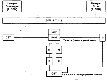 Рис. 12. Структура сети SWIFT-2 Во-вторых, это ориентация банков на открытые компьютерные системы, работающие под управлением операционной системы UNIX, что позволяет, естественно, объединять в единые вычислительные комплексы оборудование различных производителей. Это устраняет зависимость от одного поставщика и позволяет отслеживать все новации компьютерного мира в целях обеспечения конкурентоспособности своей компьютерной системы. Третье направление - интеграция различных офисных программ и компьютерных систем. Время передачи данных между компьютерами на магнитных лентах и дискетах давно прошло. Сейчас данные передаются в режиме реального времени, что позволяет каждому компьютеру, включенному в этот процесс, стать частью единой системы. Как видно из сказанного выше, потребность безболезненного объединения существующей банковской системы и интерфейса с сетью SWIFT становится самым важным аргументом выбора. Все больше .пользователей разрабатывают распределенные системы, базирующиеся на локальных компьютерных сетях, таких, как Ethernet и TokenRing. Для этих целей единственным полностью открытым интерфейсом является система TIP/SWIFT, разработанная компанией Telematic Information System (AG) (Швейцария). Многие банки во всем мире объявили о переходе на UNIX. При этом основной проблемой является стыковка современных банковских программ на основе реляционных баз данных с системами межбанковских расчетов. Программа MERVA/370, разработанная германским отделением IBM во Франкфурте, базируется на компьютерах IBM/370 и предназначена в основном для банков, которые исконно ориентированы на продукцию фирмы IBM и не спешат заменять оборудование 70-х гг. MERVA/2, разработанная под операционную систему OS/2, должна была стать альтернативной, опираясь на оборудование ST-200, используемое в качестве коммуникационного проце9сорадля больших ЭВМ. Однако этот проект не был развернут из-за нежелания партнеров IBM по банковским программам разрывать свои контракты с компанией SWIFT Terminal Service (STS). Новейшая третья версия пакета MERVA/2 была объявлена к продаже с конца ноября 1993 г. Она представляет собой универсальную межбанковскую телекоммуникационную систему, которая осуществляет не только интерфейс с сетью SWIFT, но и является инструментом для подготовки и обработки сообщений, а также обеспечивает связь с банками, не состоящими в SWIFT, посредством телекс-сети. MERVA имеет достаточно высокий потолок сообщений — более 1200 в час, удобный интерфейс пользователя и гибкую внутреннюю архитектуру. Ее легко переконфигурировать под конкретные потребности пользователя. С помощью MERVA/2 банк получает возможность подключать к SWIFT свои филиалы, расположенные в любой точке мира, например, через головной офис, при этом физическое подключение к SWIFT достаточно иметь только головному банку. При необходимости MERVA/2 может быть подключена к банковской системе на базе компьютеров AS/400, RS/6000 (имеются стандартные интерфейсы) или любой другой. В состав системы входит интерфейс прикладного программирования, который позволяет объединить MERVA/2 с произвольной банковской системой. Одной из новых возможностей пакета является поддержка стандарта USE (User Security Enhancement) (1994г.). Именно на системе MERVA/2 в начале сентября 1993г. были проведены первые сеансы с использованием стандарта USE, который поддерживает технологию автоматического обм