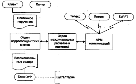 . Рис. 13. Прохождение клиентского платежного поручения В проводке по основному платежу кредитуемый счет НОСТРО не указывается. Операционист имеет возможность проконтролировать правильность сформированных проводок, внести коррективы (например, произвести оплату комиссии и почтовых расходов с другого счета клиента), добавить дополнительные проводки (за дополнительные услуги). Дебетуемые суммы блокируются на счете клиента. Автоматическая конверсия валюты (по текущему курсу) через счет конверсии проводится только в том случае, если эквивалентная сумма в долларах не превышает заранее определенного максимума. При необходимости перевода большей суммы клиенту предлагается произвести покупку валюты по специальному курсу (в отделе депозитов). Если банк бенефициара имеет счет ЛОРО в валюте платежа, то формируется сообщение МТ 100 и получателем указывается банк бенефициара Если бенефициар платежа имеет счет в банке в валюте платежа, то сообщение МТ 100 формируется, получателем указывается банк и сообщение не отправляется. После регистрации платежное поручение направляется в отдел корреспондентских счетов. Операционист имеет возможность сопроводить платежное поручение произвольным текстовым комментарием (например, указать особенности обработки данного документа). Далее клиентское платежное поручение проходит через отдел корреспондентских счетов на валютную позицию. Клиентское платежное поручение поступает в виде частично заполненного бумажного документа на специальном бланке, а также в виде электронного документа. В мемориальном ордере проставляется счет НОСТРО. Определяется также банк — получатель сообщения (он может не совпадать с банком-корреспондентом) и заносится как в бумажный документ, так и в электронный, уточняется также вид сети, по которой сообщение будет направлено получателю (TELEX, SWIFT - в зависимости от наличия ключей на обмен сообщениями). На основании прогноза наличия средств на счете НОСТРО определяется дата валютирования для платежа, которая заносится в бумажный и электронный документ, после чего платежное поручение направляется в отдел международных платежей. К сообщению может быть добавлен произвольный текстовый комментарий. В отделе международных расчетов и платежей оператором определяется по банковским справочникам цепочка банков, через которые будет выполняться платеж в том случае, если получатель сообщения не совпадает с корреспондентом. Затем оператор производит заполнение полей платежного поручения как в бумажной, так и в электронной форме, определяющих цепочку платежа (поля 053, 054, 056, 057; буква О обозначает сокращение слова optional - опционное, необязательное). В случае, если банк бенефициара совпадает с получателем сообщения, поле 057 не заполняется. Для SWIFT заполняется идентификатор банка (BIC) либо его наименование и адрес в зависимости от того, работает ли банк в сети SWIFT. Для телекса всегда заполняются наименование и адрес банка, а также прочие поля электронного документа, которые не были заполнены в группе клиентских операций и отделе корреспондентских счетов ( поля М59 (буква М обозначает сокращение от слова mandatory - обязательное), 070, 071,072, Priority). При необходимости ввода в одно из полей сообщения идентификатора банка (BIC) он выбирается из файла-справочника (классификатор) или заносится вруч