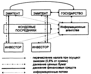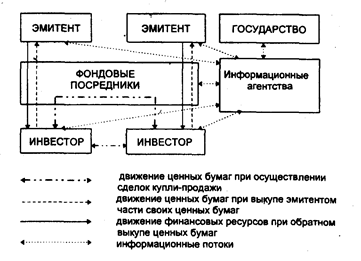 Рис. 15. Схема движения ценных бумаг, финансовых ресурсов и информации на вторичном рынке (в схеме не представлено движение финансовых ресурсов, образованных от перечисления налогов юридическими и физическими лицами). Ценные бумаги выпускаются эмитентами, которыми являются государственные органы, муниципальные органы, акционерные общества, финансово-кредитные учреждения. Эмиссия ценных бумаг производится в рамках действующего законодательства. Условия выпуска, обращения, котирования и доходности ценной бумаги определяются ее типом и назначением. Жизненный цикл акции ограничивается только жизненным циклом ее эмитента, а так как срок существования большинства компаний не ограничен, то и акция не имеет срока погашения; однако возможна ситуация, когда компания может выкупить свои акции по рыночной стоимости, хотя при их размещении таких гарантий не выдается. Акции выпускаются двух типов: обыкновенные и привилегированные (табл. 5.); последние подразделяются на кумулятивные, некумулятивные, акции с долей участия, конвертируемые акции, акции с корректируемой ставкой дивидендов, отзывные акции. Таблица 5. Характерные различия двух типов акций