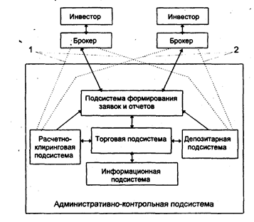 Рис. 16. Обобщенная схема функциональных подсистем биржи: взаимосвязи 1 и 2 существуют в том случае, если расчетно-клиринговые и депозитарные функции осуществляют сторонние организации Помимо информационных связей с торговой подсистемой данная подсистема имеет также информационные связи с расчетно-клиринговой и депозитарной подсистемами, откуда поступают данные о наличии денежных средств на счете брокера-покупателя и наличии ценных бумаг на счете-депо брокера-продавца. Торговая подсистема. Данная подсистема в функциональном плане включает в себя собственно проведение биржевых торгов, начиная от анализа поступающих из подсистемы заявок и отчетов данных и заканчивая совершением сделки. Подсистема функционирует только в период торговой сессии, определенный правилами проведения торгов для данной биржи. Технологическое решение биржевых торгов нашло свое отражение в торговле ценными бумагами по правилам простого или двойного аукциона. Простой аукцион - торг ведется по единому типу ценной бумаги; заявка удовлетворяется по предложенной наилучшей цене (аукцион продавца, получающего предложения покупателей, или аукцион покупателя, выбирающего лучшее предложение продавцов). Двойной аукцион - одновременная конкуренция и продавцов, и покупателей. На "электронных" биржах управление торгами осуществляется при помощи компьютера. На ряде бирж (Нью-йоркская, Американская фондовые биржи) существует специальное лицо, управляющее торгом, - специалист (маклер, сайтори). На Нью-йоркской фондовой бирже специалист при работе с книгой заявок использует маркируемые карты, на которых указывает номера сцепленных заявок, а остальная информация берется из базы данных. На Американской фондовой бирже используется сенсорное устройство для ввода информации: специалисту достаточно прикоснуться к строке экрана с выведенной на него книгой заявок, чтобы "дать добро" на заключение соответствующей сделки. На Pacific Stock Exchenge -бирже, объединяющей два торговых зала (Лос-Анджелес и Сан-Франциско), в системе SCOREX специалист выдает для нелимитированных заявок определенную команду: А - заявка реализуется по цене, назначенной системой исходя из спроса и предложения не только на данной бирже, но и на остальных биржах; В - специалист вводит наиболее выгодную цену по данной заявке из предлагаемых брокерами в "толпе"; G - специалист приостанавливает заявку при возможности улучшения цены и реализации заявки по более выгодной цене. По сцепленным заявкам оформляется сделка, данные по которой поступают в подсистему формирования заявок и отчетов, расчетно-клирин-говую и депозитарные подсистемы. Раснетно-клиринговая и депозитарные подсистемы. Данные подсистемы осуществляют расчет текущих позиций участников торгов по денежным средствам, финансовым инструментам (ценным бумагам) и итоговым обязательствам участников по завершении торговой сессии. Основная цель данных подсистем - реализация принципа трех "п": "поставка против платежа", который означает единовременное осуществление расчетов по обязательствам участников (перевод денежных средств по счетам участников совпадает с переводом ценных бумаг по счетам-депо). По международным стандартам все взаимозачеты по сделке должны быть совершены в трехдневный срок, т.е. если сделка состоялась в день t, то расчеты заве