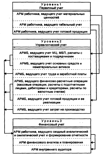 Рис. 2. Схема взаимосвязи и распределения АРМ по уровням учета в БУИС на крупном предприятии АРМ организованы по функциональным участкам, каждый из которых связан или с первичным учетом (материалов, готовой продукции (ГП), табельным учетом), или с определенным объектом бухгалтерского учета, где осуществляются непрерывная регистрация и обработка хозяйственных операций (по учету материальных ценностей (МЦ), основных средств и нематериальных активов, труда и заработной платы, финансово-расчетных операций, готовой продукции и ее реализации), а также со сводным учетом и составлением отчетности, планированием и анализом, а также внутренним аудитом. При выделении участков необходимо учитывать, что каждый участок должен отвечать следующим требованиям: • располагать своим набором хозяйственных операций и проводок; • иметь свое, возможно пересекающееся с другими участками, подмножество плана счетов; • иметь свои, присущие только ему, первичные документы и отчетные формы. Также необходимо учитывать конкретные условия, сложившиеся на предприятии, и особенности учетной политики. Для каждого АРМ или группы АРМ разрабатывается самостоятельный программный модуль. Организованная таким образом БУИС представляет собой открытую модульную систему, для которой характерна возможность добавления и удаления ее компонентов (АРМ). Это важно, потому что при разработке БУИС добавляемые со временем модули не должны вызывать перестройку всей системы. Сопоставимость информации различных АРМ обеспечивается за счет создания единого фонда нормативно-справочной информации (НСИ). В зависимости от используемых средств организационной или вычислительной техники обмен информацией между отдельными АРМ в БУИС может осуществляться двумя способами: 1) с помощью магнитных носителей (дисков); 2) по каналам связи при наличии сети, а также посредством электронного обмена данными через шлюзы модемной связи. Первый способ обеспечивает ведение учета по отдельным участкам каждого уровня. Баланс формируется за отчетный период путем слияния данных, получаемых на различных участках (файлов проводок). Второй способ наряду с ведением бухгалтерского учета по всем участкам позволяет получать оперативную информацию о текущем состоянии дел на предприятии. При таком способе обработки учетных данных удаленные АРМ, находящиеся на первом уровне (первичный учет), связаны с АРМ второго уровня (управленческий учет) электронной почтой через модемы. АРМ второго и третьего (финансовый учет) уровней взаимодействуют в сети через каналы связи. Единицей обмена данными между АРМ служит файл, состоящий из множества проводок. В процессе такого обмена результирующие файлы обновляются непрерывно по мере совершения хозяйственных операций. Таким образом, каждый уровень предусматривает переработку исходной информации , получение результирующих данных и в автоматизированном режиме передачу их на более высокий уровень. На первом уровне (первичный учет) с помощью АРМ работников, ведущих первичный учет, выполняются сбор, регистрация, накопление и частичная обработка первичной информации, возникающей в производственно-хозяйственных подразделениях предприятия (цехах, складах, подразделениях). На этом уровне функционируют АРМ по учету материальных ценностей, ведению табельного у