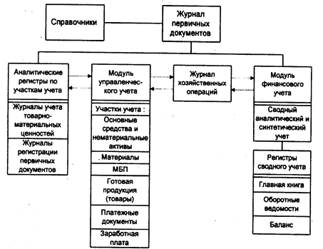 Рис. 3. Структура программного комплекса автоматизации бухгалтерского учета на малых и средних предприятиях. Модуль управленческого учета позволяет вести учет в суммовом и количественном выражении для участков учета основных средств и нематериальных активов, учета товарно-материальных ценностей (ТМЦ) и МБП, учета готовой продукции (товаров - для торговых предприятий), расчетов по оплате труда. Набор этих участков можно менять исходя из потребностей пользователей. Основными учетными регистрами данного модуля являются аналитические регистры по участкам учета - журнал учета первичных документов, журнал учета товарно-материальных ценностей, журнал учета хозяйственных операций. Модуль финансового учета позволяет вести учет по всем счетам бухгалтерского учета. Основными его учетными регистрами являются аналитические регистры (журнал первичных документов, журнал хозяйственных операций) и регистры сводного учета (Главная книга, оборотные ведомости). Связь между модулями осуществляется через Журнал хозяйственных операций. Работа с программным комплексом (рис. 4) начинается с заполнения справочников. Это делается для настройки комплекса на ведение учета на конкретном предприятии. По назначению все справочники разделены на пять групп. • Справочники общего назначения: наименования документов (SPRDOK); предприятия (SPRPR); услуги по счету—услуги связи, транспортные услуги и др. (SPRUS). • Справочники, связанные с учетными журналами ТМЦ: товарно-материальные ценности (SPRM); единицы измерения (SPRED); операции движения (SPROP). • Справочники, связанные с бухгалтерскими проводками: план - счетов бухгалтерского учета (SPRCH); бухгалтерские проводки (SPRPROV); группы проводок (SPRGR); налоги (SPRNAL). • Справочники, связанные с аналитическим учетом: объекты предприятия (SPROB); подразделения (SPRPOD); коды аналитического учета (SPRAN). • Справочники, связанные с курсами валют (SPRVAL). По структуре построения справочники делятся на простые и сложные. Простые справочники имеют стандартную структуру: код, наименование, дополнительные признаки (наименование документа, единицы измерения, услуги по счету, операции движения). Сложные справочники включают в себя два и более уровней вложенности данных. Это делается для того, чтобы облегчить работу с объемными справочниками, большое количество записей которых невозможно разместить на экране. Так, двухуровневый справочник План счетов бухгалтерского учета состоит из девяти разделов (в соответствии с планом счетов). Каждый раздел содержит соответствующий счет. Количество записей в разделах - около 20. Их целиком можно вывести на экран. Трехуровневый справочник также состоит из разделов, каждый из которых содержит подразделы. Примером трехуровневого справочника является справочник проводок, состоящий из уровней разделов счетов, счетов и проводок по каждому счету. Исходная информация вводится в базу из первичных документов. Для автоматизации используются следующие стандартные первичные документы по учету: • движения материальных ценностей (приходный ордер, приемный акт, накладная, акт на списание, требование, лимитная карта);
