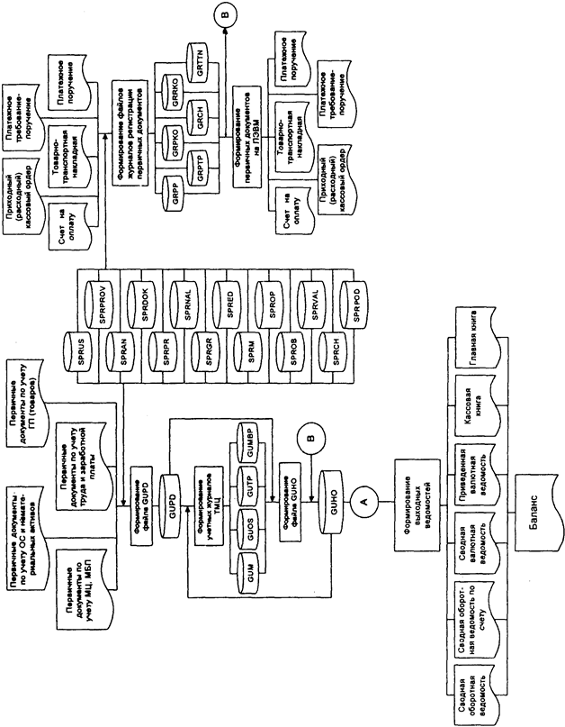 Рис. 4. Схема данных автоматизированного ведения бухгалтерского учета на предприятиях малого и среднего бизнеса. • финансово-расчетных операций (платежное поручение (ПП), платежное требование-поручение (ПТП), приходный и расходный кассовые ордера (ПКО и РКО) и др.); • основных средств (инвентарная карточка учета основных средств, акт приема-передачи, акт на ликвидацию основных средств, накладная на внутреннее перемещение); • труда и заработной платы (табель учета рабочего времени, наряд на сдельную работу, рапорт о выработке); • готовой продукции (товаров) - акт, приходный ордер, приказ-накладная, приемо-сдаточная накладная, карточка складского учета, договор поставки и другие документы. На основании информации первичных документов формируются файлы оперативной информации, в которые автоматически заносится информация соответствующих справочников. Такое использование справочников ускоряет ввод информации в базу данных, повышает ее точность и достоверность. Основным файлом оперативной информации является Журнал первичных документов (GLJPD). В него заносится информация первичных документов, по которым совершены хозяйственные операции. К учету принимаются документы, составленные по установленной форме и имеющие шесть основных реквизитов (наименование документа, номер документа, дата выписки документа, наименование предприятия, оформлявшего документ, сумма операций, дата совершения хозяйственной операции по документу). Если указаны первые пять реквизитов документа, то документ считается зарегистрированным, но по нему нельзя оформлять проводки в Журнал учета хозяйственных операций (GUHO). Это можно сделать, когда будут заполнены все шесть перечисленных выше реквизитов документа. В этом случае документ имеет юридическую силу и может быть отражен в бухгалтерии предприятия. Таким образом, основой всех учетных процедур является первичный документ, а не проводка. Главным преимуществом такого подхода является большая естественность работы с исходной информацией. Пользователь заполняет лишь поля экранной формы, соответствующие макету документа, а программа выполняет контировку. Это упрощает процедуру ввода исходной информации, сокращает число ошибок за счет облегчения визуального контроля вводимых данных. Файл GUPD включает следующие реквизиты: • наименование документа; • предприятие; • дата операции; • сумма; • название группы проводок; • комментарии; • операция движения. На основании файла GUPD формируются файлы оперативной информации по участкам учета - журналы учета товарно-материальных ценностей: • материалов (GUM); • МБП (GUMBP); • основных средств (GUOS); • готовой продукции (товаров) (GUTP); • хозяйственных операций (GUHO). На основе информации этих файлов ведутся суммовой и количественный учет материальных ценностей по местам хранения ( на складе ) или по местам нахождения (в производстве), учет основных средств и нематериальных активов, учет готовой продукции (товаров) и се реализации. Файл GUM включает следующие реквизиты: • наименование документа; • номер документа; • сумма операции; • предприятие; • дата операции; • операция движения; • наименование товарно-материальной ценности; • тип; • номенклатурный номер; • приход (объект и подразделение, счет/субсчет); • расход (объект и подразделение, счет/субсчет); • единица изм