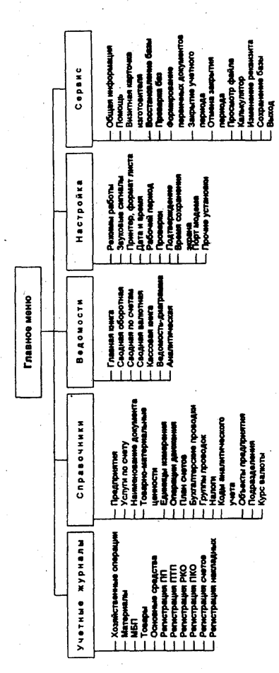 Сводная оборотная ведомость по субсчетам аналогична Сводной оборотной ведомости по счетам. Отличие заключается в том, что для счетов, имеющих субсчета, сначала формируется Сводная ведомость по счету в разрезе субсчетов с указанием сальдо и развернутых оборотов по каждому субсчету, а затем формируется Сводная оборотная ведомость по выбранному субсчету с указанием списка хозяйственных операций. Главная книга аналогична оборотной ведомости по счету, однако в отличие от нее содержит обороты по счету, свернутые по корреспондирующим счетам. Главная книга бухгалтерского учета содержит по каждому корреспондирующему счету: • начальное сальдо (дебет, кредит); • конечное сальдо (дебет, кредит); • развернутые обороты за выбранный период в корреспонденции с другими счетами (дебет, кредит). Баланс предприятия можно сформировать по любой сводной оборотной ведомости. Сводная валютная ведомость - сводная оборотная ведомость по всем валютным счетам — формируется только для одной выбранной валюты. Приведенная валютная ведомость - сводная оборотная ведомость, приведенная к одной выбранной валюте. Кассовая книга формируется из файла GUHO. Она составляется каждый день в виде установленной для кассовой книги формы. Главное меню программного комплекса по автоматизации бухгалтерского учета на малых и средних предприятиях состоит их пяти основных функций: • Учетные журналы; • Справочники; • Ведомости; • Настройка; • Сервис. Дерево диалога данного комплекса представлено на рис. 5. Функция Учетные журналы включает следующие режимы: • Хозяйственные операции; • Материалы; • МБП; • Товары; Основные средства . Регистрация ПП; • Регистрация ПТП; • Регистрация РКО; • Регистрация ПКО; • Регистрация счетов; • Регистрация накладных;
