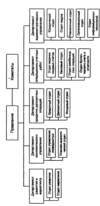 Рис. 6 Организационная структура коммерческого банка. Отдел управления ликвидностью осуществляет расчет показателей ликвидности банка, их факторный анализ и ежедневный контроль. Планово-аналитический отдел, изучая внутренние банковские показатели, устанавливает планы сбыта (например, число открываемых новых счетов), финансовый план, планирует внутренние мероприятия. Отдел рассчитывает ожидаемую сумму пассивов и решает задачу их эффективного размещения. Проводятся анализ структуры активов и пассивов банка по группам и оценка эффективности соотношения между ними. При этом должно соблюдаться «золотое правило»: длинные кредиты должны покрываться длинными депозитами и т.д. Департамент кредитив - депозитных операций включает кредитный, депозитный и фондовый отделы. Кредитный и фондовый отделы дополняют друг друга, не только выполняя принятую стратегию банка в кредитной и инвестиционной политике, но и оперативно реагируя на требования, выдвигаемые сложившейся экономической ситуацией на рынке капитала. Например, в период экономического роста объем ссуд увеличивается, а портфель ценных бумаг сокращается; в периоды низкого спроса на ссуды картина меняется. Функции кредитного и депозитного отделов, несмотря на принципиально разное содержание их операций, по форме очень близки. Сходство функций выражается в необходимости выполнения весьма трудоемких работ по проверке и соблюдению целого ряда формально-правовых принципов кредитования, которые должны соблюдаться как кредиторами, так и заемщиками. Отличие обусловливается тем, кто является ссудозаемщиком, а кто кредитором, - банк или клиент. В любом случае, как и при выполнении большинства услуг банка, взаимоотношения клиента и банка регулируются договором, который они заключают. Проверка кредитоспособности является предпосылкой для всех других действий банка по отношению к ссудозаемщику, т.е. осуществляются анализ возможности обеспечения выплаты кредита и своевременность взносов, процентов и других платежей физическим и юридическим лицом. Эта проверка требует анализа баланса заемщика, ликвидности залога, ежегодного финансового отчета и ряда других регистров, содержащих показатели работы предприятия. Департамент операционно-учетных работ (ОУР) реализует весь комплекс задач по открытию и закрытию лицевых счетов, выполнению кассовых операций, ведению лицевых счетов, выполнению расчетов по поручению каждого клиента, ведению межбанковских операций, ведению бухгалтерского учета на синтетическом уровне и составлению отчетности, которая используется как самим банком (ревизия и контроллинг), так и учреждениями внешней среды (вышестоящие, налоговые и другие органы). Этот департамент выполняет следующие функции: • расчет и распределение доходов и налогов между бюджетами; • учет расчетно-платежных документов до наступления срока платежа и не оплаченных в срок; • обеспечение правильных и своевременных расчетов между клиентами; • начисление и списание процентов по текущим и расчетным счетам; • учет ценностей и документов на внебалансовых счетах; • учет срочных обязательств по ссудам; • депонирование средств для выдачи чековых книжек, аккредитивов и акцептов платежных поручений; • организация и контроль операций межфилиального оборота; . • составление баланса.