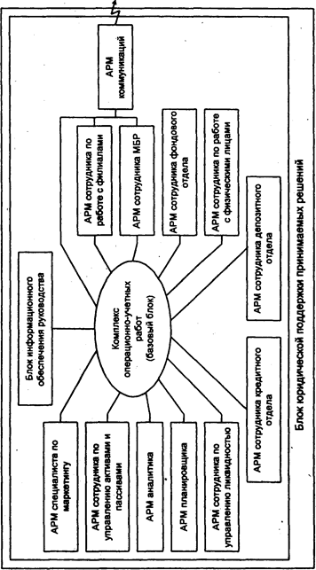Рис. 7. Структура интегрированной БИС. по управлению активами и пассивами, АРМ аналитика, АРМ планировщика, АРМ сотрудника по управлению ликвидностью и др. Блок информационного обеспечения руководства предназначается для поддержки и принятия решений руководства банка и формирует аналитическую информацию по результатам деятельности банка. Обычно этот блок выполняется в виде АРМ, который реализует получение сведений о ликвидности банка и другой стратегической информации, а также данных о состоянии счетов, архивных справок и пр. Если банк обладает филиалами, то в его структуре предусматривается отдел, обеспечивающий обмен информацией с ними в режиме on-line с ис^-пользованием телекоммуникационных каналов через АРМ коммуникаций либо в режиме off-line на основе электронной почты, дискетой или бумажной технологии. АРМ по работе с филиалами дает сотруднику возможность ввода информации о финансовых операциях филиалов, учета их деятельности при формировании консолидированного баланса, анализа деятельности филиалов и расчета для них нормативных коэффициентов. Работа с, внешней средой осуществляется по каналам телекоммуникаций через АРМ коммуникаций. АРМ обеспечивает экспорт-импорт информации, т.е. двусторонний обмен данными с внешними абонентами: ЦБ РФ (ГВЦ ОПЕРУ, РКЦ), филиалами, системой межбанковских расчетов, процессинговым центром (Union Card, STB-Card и др.), пунктом обмена валюты, клиентами, биржей и пр. При использовании телекоммуникационной среды происходят трансформация передаваемой информации в определенный стандарт, ее шифрование (обычным способом и с применением электронной подписи) и установление связи: либо напрямую с использованием телефонных и других каналов, либо через какую-либо компьютерную сеть (рис. 8). Для обеспечения взаимодействия по схеме клиент-банк у клиента устанавливается программный комплекс АРМ клиента, который позволяет: вводить, редактировать платежные документы с использованием типового набора бланков, печатать подготовленные документы, шифровать и дешифровать информацию и обеспечивать авторизацию через механизм электронной подписи, отправлять и принимать документы, файлы и сообщения. В банке внутри базового блока устанавливается для взаимодействия с клиентом АРМ банка. Этот комплекс обеспечивает через АРМ коммуникаций аналогичные функции по взаимодействию с клиентом, поддерживает архивы взаимодействия с клиентом и отправляет поступившие платежные документы по ЛВС на обработку в нужный АРМ. АРМ сотрудника межбанковских расчетов (МБР) обеспечивает ведение расчетов с другими коммерческими банками через системы РКЦ и ОПЕРУ, через сеть клиринговых центров и через взаимное открытие корреспондентских счетов. При работе на основе прямых межбанковских расчетов АРМ позволяет осуществлять контроль, корректировку и отмену текущих операций МБР и формирование начальных авизо, реестров и соответствующих платежных документов. При работе с ответными авизо