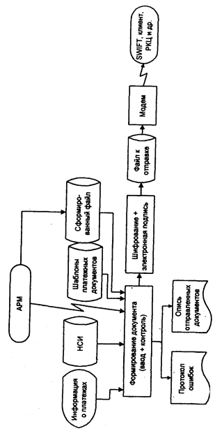 Рис. 8. Схема работы АРМ коммуникаций по экспорту данных. АРМ проводит весь комплекс работ с входным документом: ввод, корректировку, отмену текущих документов (с одновременным контролем сумм авизо и платежных документов); выполнение квитовки ответных авизо, ведение соответствующего журнала и документов по квитовке; открытие, ведение и закрытие заключительных оборотов. Для проведения электронных взаимодействий с другими банками, клиентами, процессинговым центром или биржами информация пересылается по ЛВС на АРМ коммуникаций, через которое реализуются телекоммуникационные взаимодействия. АРМ сотрудника кредитного отдела (АРМ СКО) обеспечивает заключение и ведение договора, его пролонгацию и закрытие (поступление в архив), формирование графиков погашения основного долга и выплаты процентов по различным схемам, а также контроль выполнения этих графиков и начисление пеней по основной части долга и по процентам. При этом формируется ряд ведомостей. АРМ поддерживает стандартные и индивидуальные процентные ставки: по основной части долга, за неиспользованный кредит (если это не указано в договоре), за просроченный возврат ссуды или за несвоевременную выплату процентов за кредит. АРМ сотрудника по работе с физическими лицами все чаще включается в состав БИС, что обусловлено необходимостью привлечения средств от физических лиц, хотя эти операции связаны с большой трудоемкостью из-за массовости. В основном они носят характер депозитных операций, и поэтому данный АРМ принципиально отличается от АРМ сотрудника депозитного отдела лишь специфическим набором оказываемых услуг. АРМ. сотрудника фондового отдела обеспечивает выполнение политики банка в части фондового портфеля, а также выполнение доверительных соглашений с физическими и юридическими лицами. АРМ включает такие режимы, как оценка экономического состояния объекта инвестиций, расчет аналитических показателей по ценным бумагам, оценка инвестиционной привлекательности объекта, портфеля ценных бумаг, учет поступления и движения ценных бумаг. АРМ сотрудника депозитного отдела обеспечивает привлечение временно свободных средств. Относительно предметной технологии в этот АРМ включаются такие же режимы, как и в АРМ СКО: заключение договора, расчет процентов по различным схемам, причисление их к остатку и др. Проблемой банковской технологии остается разграничение функций между базовым модулем, реализующим комплекс операционно-учетных работ, и АРМ сотрудников других отделов. Например, в настоящее время существуют две наиболее распространенные технологии начисления процентов за кредит. По первой технологии начислением процентов занимается базовый блок, а сотрудник кредитного отдела лишь пересылает в него данные для расчетов и осуществляет контроль за этими операциями по графику платежей и за отклонениями от него. По второй технологии взаимосвязь между этими отделами осуществляется на уровне проводок, при этом сотрудник кредитного отдела генерирует их, а операционно-учетный модуль выполняет ведение кредитных счетов, просмотр работы по счету и расчет процентов по кредитам (в соответствии с желанием сотрудника кредитного отдела). Как показывает опыт, контроль документов, проходящих по договорам, сотрудниками кредитного и депозитного отделов более расп
