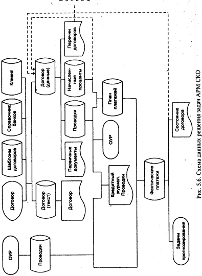 Рис. 9. Схема данных решения задач АРМ СКО. Для регистрации нового кредитного договора и для вывода его на экран при просмотре и редактировании используется соответствующий макет, на основе которого осуществляется визуальный и логический контроль ввода. Контроль вводимой информации весьма важен, поскольку, если программные ошибки могут быть в большинстве случаев легко устранимы программистом при обнаружении в ходе эксплуатации, ошибки информационной базы трудно распознаваемы и предопределяют ошибки при любых вычислениях. Такой контроль традиционно выполняется визуальным и форматным способами. Логический же метод контроля используется реже, так как требует от программиста дополнительных затрат времени на его реализацию. Работа с текстовой частью договора заключается в традиционных операциях по вводу текстовой информации, ее просмотру, полноэкранному редактированию и удалению. Технологически договор может иметь различный статус: черновик, условно действующий, реально действующий и завершенный. Первоначально составленный черновик переходит в статус условно действующего при его подписании. Договор приобретает статус реально действующего после перемещения на его основании финансовых средств. После окончания расчетов между ссудозаемщиком и банком договор приобретает статус завершенного. Реально действующий договор может иметь уточненный статус: нормально действующий, просроченный и пролонгированный. В последнем случае дата договора соответствует дате пролонгации, а его сумма равна сумме выбранных платежей. Редактирование и удаление договоров из базы возможно только при статусе черновика. Договоры с остальными статусами могут только просматриваться. В связи с объемом текста договора необходимо предусмотреть не только полнотекстовый, но и сокращенный просмотр. При перечислении средств на ссудный счет, на расчетный счет, пролонгации договора или переводе его на счет просроченных ссуд формируются проводки, которые передаются в отдел операционно-учетных работ. На основе файлов проводок и начисленных процентов формируется файл плановых платежей по договору. Он обрабатывается совместно с файлом проводок, поступившим из операционного дня, в результате чего образуется файл платежей по договору. На основе последнего формируются ведомости состояния договора, кредитный журнал и др. При пролонгации этот цикл повторяется, но статус договора меняется. Если же договор переводится в просрочку, меняется не только статус договора, но и начинается начисление пенсий. И в том, и в другом случае формируются соответствующие проводки. При закрытии договора меняется лишь его статус. Для расчетов по предоставленным кредитам обычно применяется файл процентов (начисленные проценты). Файл Договор (данные) содержит следующие реквизиты : статус договора; номер договора; номер пролонгации; номер расчетного счета (или 0); номер ссудного счета; адрес перехода остатка задолженности; номер счета просрочки; степень надежности возврата кредита; количество частей погашения; процентная ставка на основную часть долга; процентная ставка пеней на проценты; вид погашения ссуды (равными долями и др.); сумма по договору; сумма начисленных процентов; дата начала действия договора; дата закрытия договора; итоговая сумма погашения долга; ито