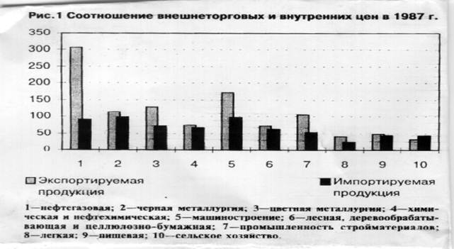 Рис. 1. Относящиеся к 1987 году оценки Госкомстата РФ соотношений внутренних и внешнеторговых цен дают в целом сходную картину при сравнении и по кругу экспортируемых, и по кругу импортируемых товаров (см. рис.1). При этом важны не абсолютные значения (обменный курс рубля весьма заметно отличался от его покупательной способности), а их различия по секторам. Такая ситуация могла существовать прежде всего благодаря тому, что внешняя торговля была жестко централизована. Причем решения в очень небольшой степени учитывали экономическую эффективность, измеренную в действующих ценах: в расчетах с производителями применялся спектр специальных обменных курсов, дифференцированных по отраслям и по группам продукции. В итоге Советский Союз имел сравнительно низкую интегрированность в мировую экономику. Экспорт и импорт охватывали довольно узкий и неизменный круг продукции (поставки преимущественно нефти, газа, леса, военной техники и закупки зерна, оборудования, товаров легкой промышленности). [14, с. 9-10] "Открытие" экономики в ходе экономических реформ, введение частичной конвертируемости рубля неизбежно должны были привести (и привели) к сближению первоначально очень далеких друг от друга систем цен, что также стало одним из главных источников инфляции. Переход к рыночному определению обменного курса привел к его неадекватному скачку в начале 1992 года и сделал все внутренние цены в долларовом выражении на порядок меньшими мирового уровня. Так, средняя цена нефти на российском рынке составила в 1992 году лишь 11 долларов за тонну, газа - 3 доллара за тысячу кубометров. Вследствие этого вся экономика испытывала инфляционное давление со стороны цен экспортируемых товаров. Как уже отмечалось, важную роль в поддержании инфляции сыграл также происшедший за годы реформ глубокий спад производства. В первом квартале 1996 года объем промышленного производства составил 49 % по сравнению с аналогичным периодом 1991 года. Часть этого спада объясняется такими упоминавшимися "внешними" причинами, как дезинтеграция единого рынка бывшего СССР и распад СЭВ, однако другая - тесно связана с проводимыми реформами и стабилизационной политикой. Значительная часть спада, на наш взгляд, обусловлена быстрым "открытием" экономики, в результате чего многие предприятия легкой и пищевой промышленности, бытовой электроники и т.д. оказались потеснены на отечественном рынке. [15, с. 3] Взаимосвязь спада и инфляции развивается по нескольким спиралям. Во-первых, в процессе сокращения производства значительно растут издержки на единицу продукции, поскольку существенную их долю составляют "фиксированные затраты". В частности, спад не сопровождался адекватным сокращением численности занятых. Таким образом, уменьшение объемов производства создает затратное давление на цены. Вторую "спираль" взаимного усиления составляют объем производства и расходы госбюджета. В рамках стабилизационных программ правительство вынуждено идти на уменьшение своих расходов, сокращая тем самым конечный спрос. Это влечет за собой дополнительное уменьшение выпуска и, следовательно, дальнейшее снижение поступления налогов. Борьба с инфляцией путем сжатия денежной массы (по отношению к производимому продукту) ведет к нехватке денежных, а следовательно, и материальных оборотных средств, что, к