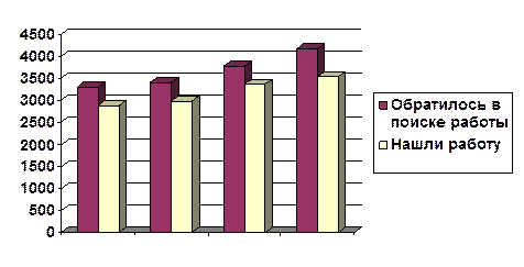 Вывод: на протяжении последних лет прослеживается увеличение числа граждан, ищущих работу первый раз. С 1999 по 2001 наблюдается снижение числа граждан, работавших по рабочей специальности, но уже в 2002 году их число увеличилось. Число граждан, работавших на должности служащих, остаётся почти неизменным.