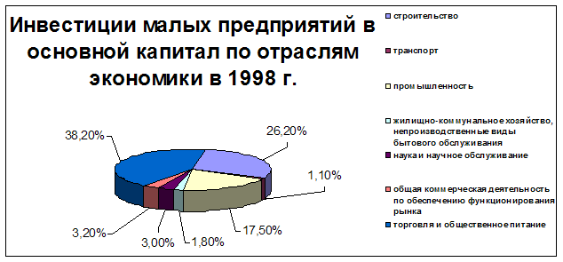В 1998 г. среднемесячная заработная плата всех категорий работников малых предприятий составляла 816,5 рубля (по крупным и средним предприятиям - 1100,7 рубля). Следует отметить также, что общим для всех экономических районов является значительный рост среднемесячной оплаты труда работающих по сравнению с ростом их численности. Поэтому, говорить о решении проблемы занятости в стране ещё рано, так как основная часть работающих в народном хозяйстве занята на уже действующих предприятиях. В 1998 г. малыми предприятиями было произведено продукции, работ, услуг по всем видам деятельности на 261,9 млрд. рублей, это по оценке, составило около 7% выпуска продукции, работ и услуг всех отраслей экономики России, занимающихся производством товаров и оказывающих рыночные услуги. Обьём произведенной малыми предприятиями продукции в фактических ценах уменьшился по сравнению с 1997 г. на 13,6%. По основному виду деятельности предприятий было произведено продукции, работ, услуг на 231,8 млрд. рублей, три четверти этого объема приходиться на валовой доход предприятий торговли и общественного питания (26,1%), выпуск промышленной продукции (24,2%) и объем произведенных строительных работ (26,1%). Инвестиции малых предприятий в основной капитал в 1998 г. составили 22,5 млрд. рублей, или 5,6% всех инвестиций на развитие экономики и социальной сферы России. По сравнению с 1997 г. в сопоставимых ценах они уменьшились на 3,5%. В 1998г. произошли изменения в отраслевой структуре инвестиций