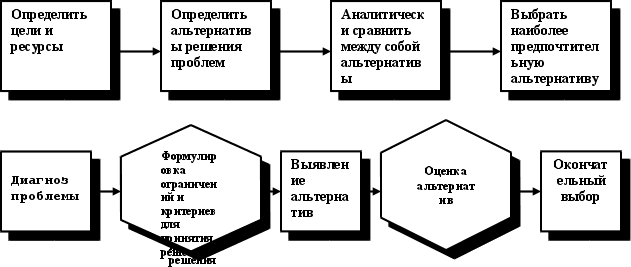 Целью написания данной работы является анализ, рассмотрение процесса принятия решений для более глубокого понимания его сущности. В работе будут рассмотрены типы решений, принимаемых управляющими, используемые способы, научные методы повышения эффективности этого процесса и основные факторы, которые необходимо учитывать при принятии управленческих решений. ГЛАВА 1. Природа процесса принятия решений1.1 Организационные решенияДля более четкого понимания процесса принятия решений подробнее рассмотрим всеобщность принятия решений, органической взаимосвязью руководителя с процессом управления и некоторыми характеристиками организационных решений. Принятие решений отражается на всех аспектах управления. Принятие решений – часть каждодневной работы управляющего. Как уже отмечалось, поскольку характер работы менеджера зависит от уровня управления, на котором он находится, существуют и различия и в характере решений, принимаемых на разных уровнях. Тем не менее все эти роли периодически исполняет каждый менеджер. Решение – это выбор альтернативы. По сути дела – это ответ на ряд вопросов. В наше сложное время многие альтернативы находятся в руках у менеджеров, и, чтобы сформулировать цель перед группой людей и добиться ее выполнения необходимо дать ответы на многочисленные вопросы. Каждая управленческая функция связана с несколькими общими, жизненно важными решениями, требующими претворения в жизнь. Некоторые из них перечислены в табл.1 (см. прил.1) Введем некоторые понятия. ОРГАНИЗАЦИОННОЕ РЕШЕНИЕ – это выбор, который должен сделать руководитель, чтобы выполнить обязанности, обусловленные занимаемой им должностью. Цель организационного решения – обеспечение движения к поставленным перед организацией задачам. поэтому наиболее эффективным организационным решением явится выбор, который будет на самом деле реализован и внесет наибольший вклад в достижение конечной цели. Организационные решения можно квалифицировать как запрограммированные и незапрограммированные. Запрограммированные решения – результат реализации определенной последовательности шагов или действий, подобных тем, что принимаются при решении математического уравнения. Как правило, число возможных альтернатив ограничено и выбор должен быть сделан в пределах направлений, заданных организацией. Определив, каким должно быть решение, руководство снижает вероятность ошибки. Руководство зачастую программирует решения под ситуации, повторяющиеся с определенной регулярностью. В административных органах существуют организационные системы решения сложных проблем выбора, которые состоят из утвержденных правил сбора и анализа информации (обычно со сроками), порядка рассмотрения вариантов, из согласования и утверждения. Так, например, организационная система подготовки пятилетнего плана министерства или ведомства может включать в себя: получение директивных указаний от вышестоящего органа, разработку прогнозов, сбор предложений от организаций, обсуждение предложений специальными комиссиями или научными советами, окончательное утверждение предложений комиссий. Во многих случаях организационные системы решения проблем выбора возникают на основе опыта решения подобных задач в прошлом. рассматривая эти системы с формальной стороны, след