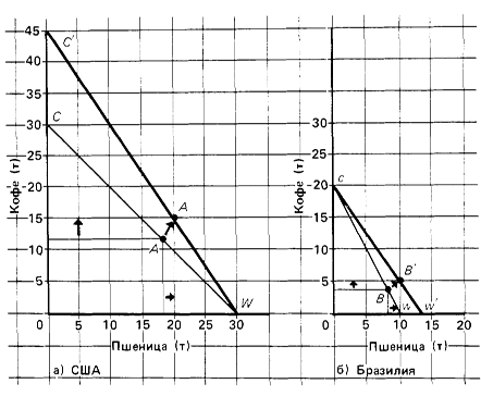 Рисунок 2. Линии торговых возможностей и выигрыш от торговли Теперь США и Бразилия не скованы прямой внутренних производственных возможностей. Специализация и торговля привели к появлению нового соотношения обмена пшеницы и кофе, которое представлено прямыми торговых возможностей стран. Это новое соотношение является более совершенным для обеих стран по сравнению с соотношением обмена в условиях самообеспечения, показанного прямыми производственных возможностей каждой из стран. Специализация, основанная на использовании принципа сравнительных преимуществ, способствует более эффективному размещению мировых ресурсов и увеличению производства как пшеницы, так и кофе, а потому выгодна и США, и Бразилии.. В результате специализации и торговли обе страны имеют большее количество каждого вида продуктов (точки A' и B’ против A и B на рис. 2а и 2б). Эти показатели сведены воедино в таблице 4, которая заслуживает внимательного изучения. Таблица 4 Международная специализация в соответствии с принципом сравнительных преимуществ и выигрыш от торговли (гипотетические данные; т)
