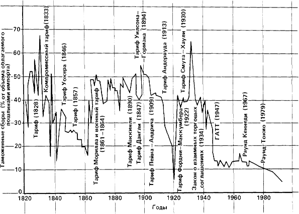 Рисунок 4. Таможенные пошлины в США в 1820—1988 гг. 6.1. Закон о взаимной эквивалентной торговле и ГАТТПервым законом, вызвавшим тенденцию к снижению уровня пошлин, стал Закон о взаимных торговых соглашениях 1934 г. Будучи специально направленным на снижение пошлин, закон включал два основных положения. 1. Полномочия по ведению переговоров. Закон о взаимной эквивалентной торговле наделял президента правом вести переговоры и заключать соглашения с иностранными державами о снижении американских пошлин до 50% от существующего уровня. Снижение тарифов зависело от готовности других стран идти на взаимные уступки, направленные на снижение пошлин на американский экспорт. 2. Общее снижение пошлин. Если бы снижение пошлин было достигнуто в результате включения в эти соглашения положения о режиме наибольшего благоприятствования, оно относилось бы не только к определенной стране, ведущей переговоры с США, но приняло бы всеобщий характер. Однако закон о взаимной торговле дал начало только двусторонним переговорам (между двумя странами). Этот подход был расширен в 1947 г., когда 23 страны, включая США, подписали Генеральное соглашение о тарифах и торговле (ГАТТ). ГАТТ основано на трех кардинальных принципах: 1) равный, недискриминационный режим для всех стран-участниц; 2) снижение пошлин путем проведения многосторонних переговоров; 3) устранение импортных квот. По существу, ГАТТ есть не что иное, как форум для ведения переговоров по тарифным барьерам на многосторонней основе. В настоящее время в ГАТТ входят почти 100 стран, и нет ни малейшего сомнения в том, что оно явилось важным фактором в развитии тенденции либерализации торговли. Под его эгидой в послевоенный период были проведены семь раундов переговоров по снижению торговых барьеров. В 1986 г. в Уругвае начался восьмой раунд переговоров в рамках ГАТТ. В повестку дня "уругвайского раунда" были включены следующие предложения: 1) устранение торговых барьеров и субсидий в сельском хозяйстве; 2) снятие барьеров в торговле услугами (на услуги приходится около 20% международной торговли); 3) уничтожение ограничений на иностранные инвестиции; 4) внедрение на международной основе патентных, авторских прав, прав на торговую марку. 6.2. Экономическая интеграцияДругим решающим сдвигом в сторону либерализации торговли стала экономическая интеграция — объединение рынков двух и более стран в зону свободной торговли. Примерами экономической интеграции являются Европейское экономическое сообщество (ЕЭС) и Американо-канадское соглашение о свободной торговле. Общий рынок. Наиболее ярким примером экономической интеграции является Европейское экономическое сообщество (ЕЭС) или, как его часто называют, "Общий рынок". Возникнув в 1958 г., ЕЭС сейчас включает 13 западноевропейских стран. Цели. "Общий рынок" выступает за: 1) постепенную отмену пошлин и импортных квот на все товары, которыми торгуют между собой 13 стран-участниц; 2) установление общей системы пошлин в отношении всех товаров, получаемых из стран, не входящих в "Общий рынок"; 3) достижение в конечном счете свободного движения капитала и рабочей силы в рамках "Общего рынка" и 4) разработку общей политики по ряду других экономических аспектов, вызывающих взаимный интерес, например по сельскому хозяйству, транспорту, ограничительной деловой практике. Итоги. Мотивы,
