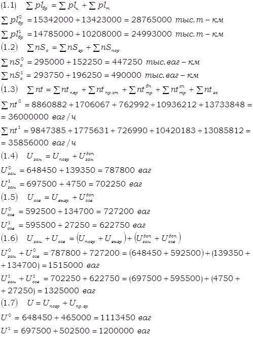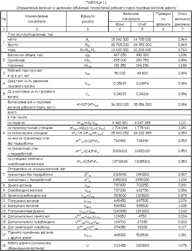 Реферат: Расчет и анализ показателей объема работы и использования подвижного состава Ж/ДРеферат: Расчет и анализ показателей объема работы и использования подвижного состава Ж/Динистерство Путей Сообщения РФ Дальневосточный Государственный УниверситетПутей СообщенияКафедра: Бух учет и аудитКурсовая на тему: «Расчет и анализ показателей объема работы и использования подвижного состава Ж/Д» Выполнил: Тухватуллин Р.Р. Проверила: Михаленко Н.В. г. Хабаровск 2000 г. Введение. 5 1. Определение величин и динамики объёмных показателей рабочего парка грузовых вагонов 8 2. Анализ динамики объёмных показателей рабочего парка грузовых вагонов 10 2.1 Анализ динамики тонно-километров брутто 10 2.2 Анализ динамики вагоно-километров общих 10 2.3 Анализ динамики балансовых вагоно-часов 10 2.4 Анализ динамики работы дороги 11 3. Определение величин и динамики качественных показателей рабочего парка грузовых вагонов 12 4. Определение динамики качественных показателей рабочего парка грузовых вагонов 17 4,1 Анализ динамики среднесуточной производительности грузового вагона рабочего парка 17 4,2 Анализ динамики средней динамической нагрузки рабочего вагона 18 4,3 Анализ динамики среднесуточного пробега грузового вагона рабочего парка 19 4,4 Анализ динамики полного рейса грузового вагона рабочего парка 20 4,5 анализ динамики среднего времени оборота грузового вагона рабочего парка 21 5 Определение величин и динамики показателей грузовых поездов и поездных грузовых локомотивов 22 6 Анализ динамики объёмных показателей грузовых поездов и поездных грузовых локомотивов 24 6,1 Анализ динамики тонно-километров брутто 24 6,2 Анализ динамики локомотиво-километров линейного пробега поездных локомотивов 25 6,3 Анализ динамики локомотиво-суток поездных грузовых локомотивов 25 7 Определение величин и динамики качественных показателей грузовых поездов и поездных грузовых локомотивов 26 8 Анализ динамики качественных показателей использования грузовых поездов и поездных грузовых локомотивов 28 8,1 Анализ динамики среднесуточной производительности поездного грузового локомотива 28 8,2 Анализ динамики среднего веса брутто грузового поезда 29 8,3 Анализ динамики коэффициента вспомогательной работы локомотива 30 8,4 Анализ динамики среднесуточного пробега поездного грузового локомотива 31 9 Определение влияния изменения основных качественных показателей использования подвижного состава на связанные с ними показатели 33 9,1 Определение влияния изменения среднесуточной производительности рабочего грузового вагона на рабочий парк грузовых вагонов 33 9,2 Определение влияния среднего веса нетто рабочего вагона на вагоно-километры гружённые 33 9,3 Определение влияния изменения среднесуточного пробега рабочего грузового вагона на общие вагоно-километры 34 9,4 Определение влияния среднесуточной производительности поездного грузового локомотива на эксплуатируемый парк локомотивов 34 9,5 Определение влияния веса брутто грузового поезда на пробег поездов 35 9,6 Определение влияния среднесуточного пробега поездного грузового локомотива на линейный пробег грузовых локомотивов 35 9,7 Определение влияния коэффициента порожнего пробега вагонов к гружённому на среднесуточную производительность рабочего грузового вагона 36 9,8 Определение влияния коэффициента вспомогательного линейного п