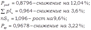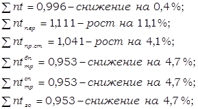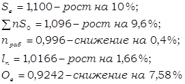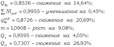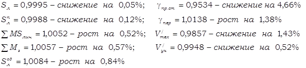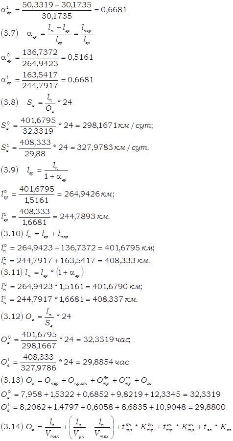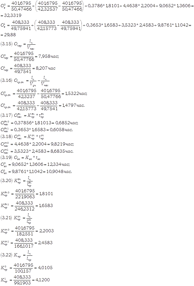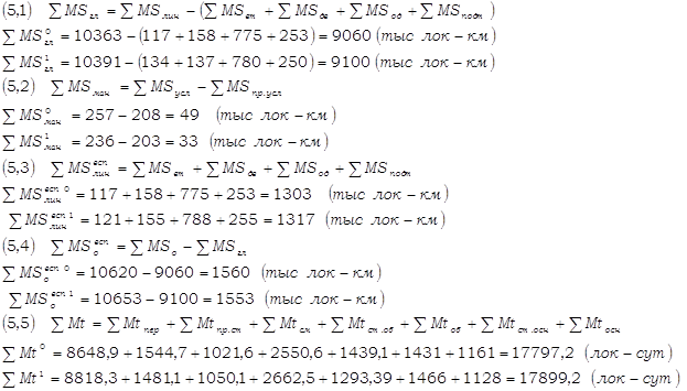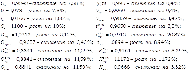 Вывод по формуле определения в количественном отношении: Среднее время оборота грузового вагона рабочего парка в отчётном периоде по сравнению с базисным снизилось на 7,58% за счёт снижения общих вагоно-часов грузовых вагонов рабочего парка на 0,4% и увеличения на 7,8% количества обернувшихся вагонов. Снижение среднего времени оборота грузового вагона рабочего парка положительно повлияло на работу железной дороги. Вывод по формуле взаимосвязи (3,12) в качественном отношении: Среднее время оборота грузового вагона рабочего парка в отчёте снизилось на 7,58% из-за увеличения полного рейса рабочего грузового вагона рабочего парка на 1,66% и среднесуточного пробега на 10%. Уменьшение полного рейса рабочего грузового вагона в большей степени, чем среднесуточного пробега положительно повлияло на динамику анализируемого показателя и на работу дороги в целом. Вывод по формуле взаимосвязи (3,13) в качественном отношении: Среднее время оборота грузового вагона рабочего парка в отчётном месяце по сравнению с базисным месяцем сократилось на 7,58%. Это произошло за счёт снижения среднего времени оборота рабочего грузового вагона на промежуточных станциях (3,43%), на технических станциях (с переработкой и без) (11,59% каждое),на грузовых станциях (11,59%) и увеличения среднего времени оборота рабочего грузового вагона на промежуточных станциях (3,12%). Вывод по формуле взаимосвязи (3,14) в качественном отношении: Среднее время оборота грузового вагона в отчёте уменьшилось на 7,58%. На изменение данного показателя оказали влияние следующие факторы: ® увеличение полного среднего рейса рабочего грузового вагона на 1,66%; ® уменьшение технической и участковой скоростей движения рабочего грузового вагона на 1,42% и 0,4% соответственно; ® уменьшение среднего простоя рабочего грузового вагона на станции без переработки 3,5%; ® значительное снижение времени среднего простоя рабочего грузового вагона на станции с переработкой на 20,87%; ® снижение среднего простоя под одной грузовой операцией на 3,32%; ® снижение среднего количества пройденных за время оборота вагона транзитных без переработки станции и станций занятия и освобождения вагона на 8,39% и 3,32% соответственно; ® увеличение среднего количества пройденных за время оборота вагона транзитных с переработкой станции на 11,72%. Анализируемый показатель увеличился, и это изменение положительно сказалось на работе железной дороги. 5 Определение величин и динамики показателей грузовых поездов и поездных грузовых локомотивовНа основе исходных данных задания заполняем ТАБЛИЦУ 5.1 «Объёмные показатели грузовых поездов и поездных локомотивов». На основании расчётов, произведенных в ТАБЛИЦЕ 5,1 необходимо проверить их правильность по следующим формулам взаимосвязи: