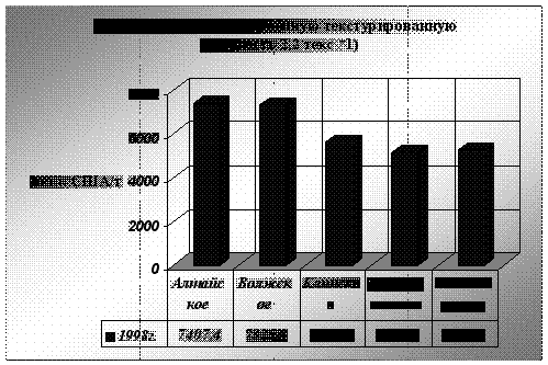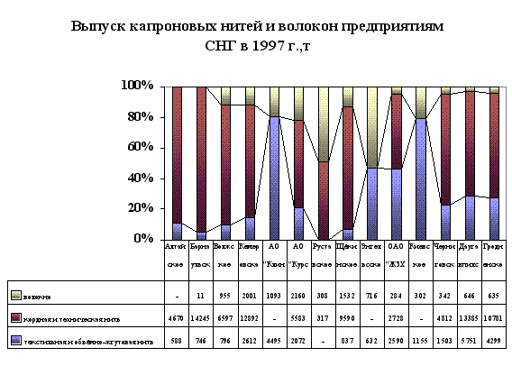 Рис.3.11 Мощности по ковровым полиамидным нитям в мире на сегодняшний день оцениваются в 1,2 млн. тонн. Основными производителями их являются США – 50% мировых мощностей и Западная Европа – более 20%. К 2000 году ожидается рост мощностей в мире на 13%. Около 2 млн. тонн составляют мировые мощности по полиамидным текстильным нитям, их рост к 2000 году составит не более 8%. На рынке СНГ по выпуску капроновой нити специализируется 14 предприятий. Для ориентировочного определения веса каждого из предприятий на рынке СНГ, ниже приведены данные о выпусках различных видов капроновых нитей и волокон этими предприятиями за 1997 год (рис.3.12):